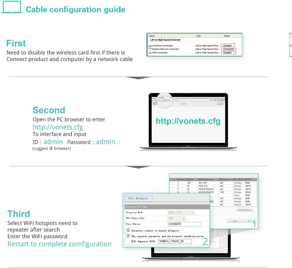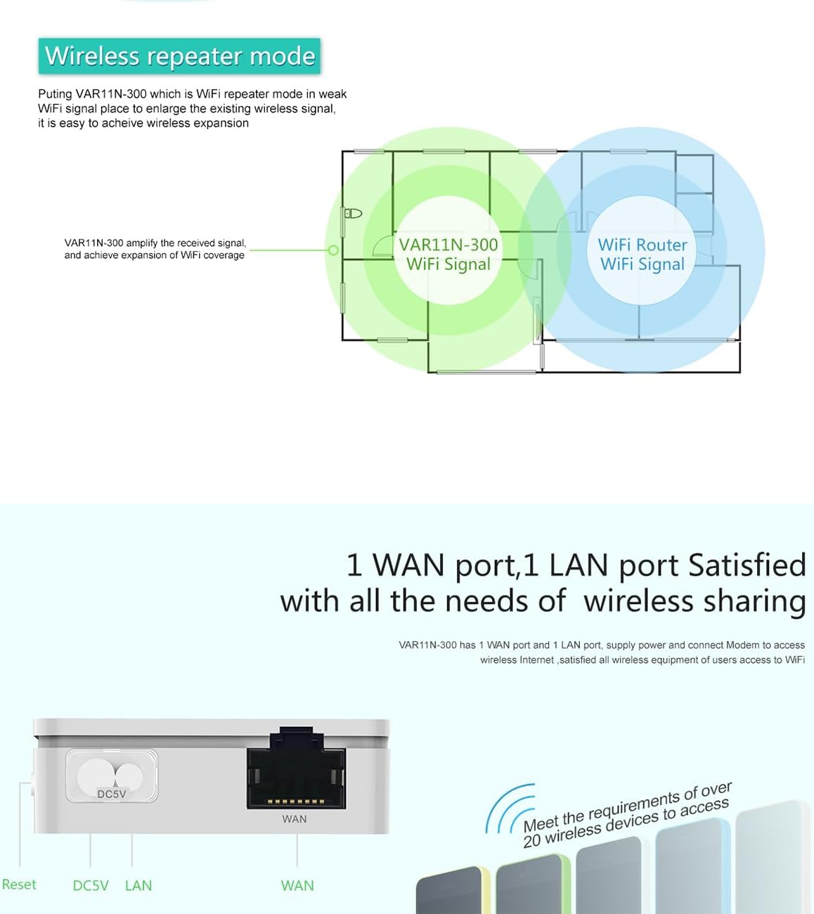 ✅【Wireless Quick Configuration】: disable local connection and make connection to VAR11N-300 hot spot; open browser, input virtual configuration domain name, and enter default username and password(admin); Select wifi, enter password and submit, then restart to complete the configuration