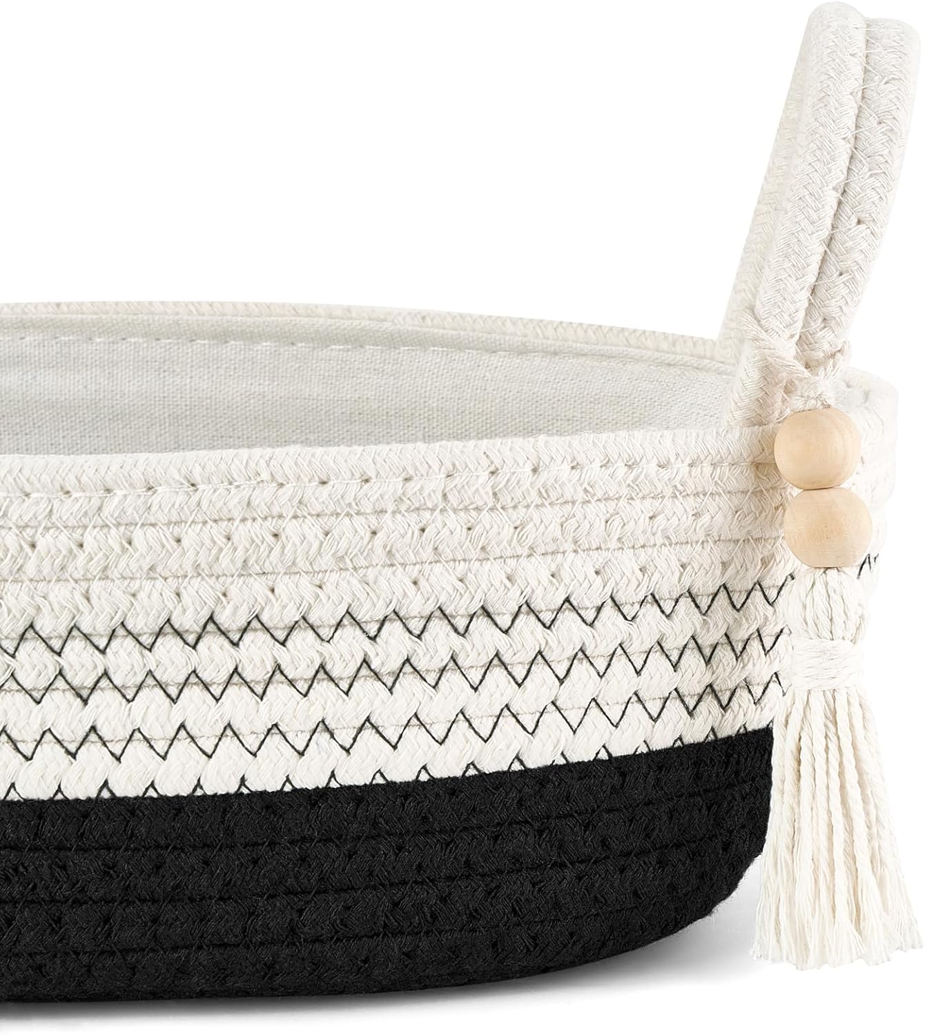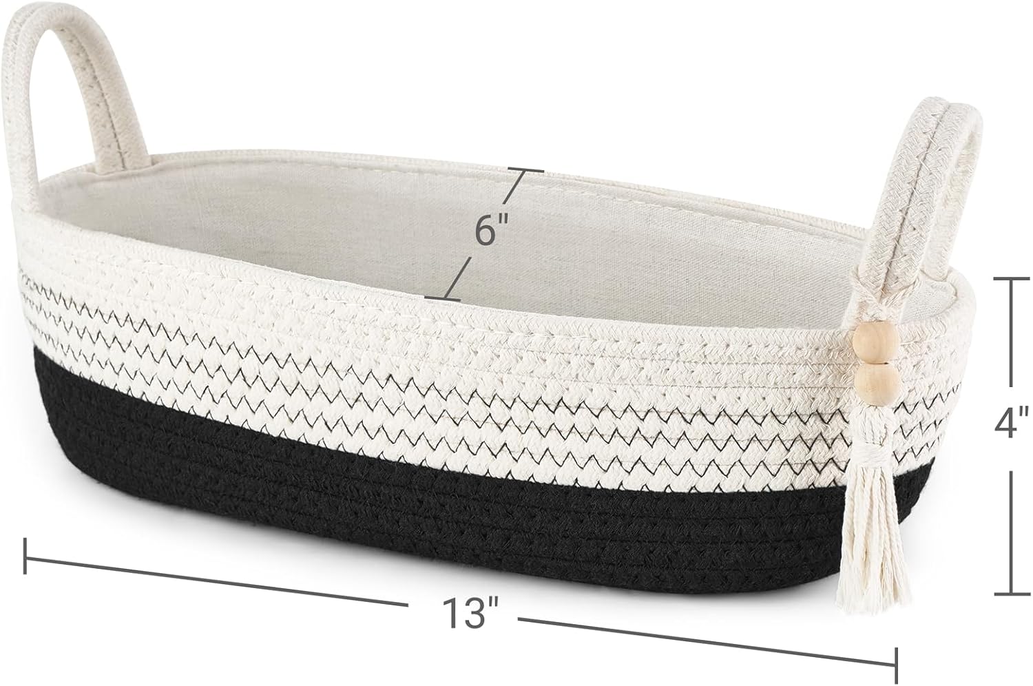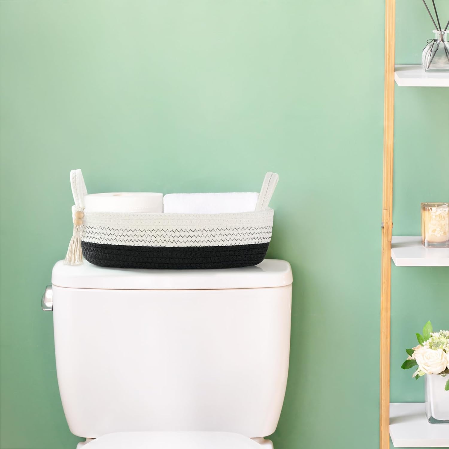 Mkono Small Storage Basket for Toilet Tank Top Boho Bathroom Decor Woven Rope Toilet Paper Tray Back of Toilet Organizer for Shelf Bedroom Living Room, Black and White, 1 Pack, 13″ L x 6″ W