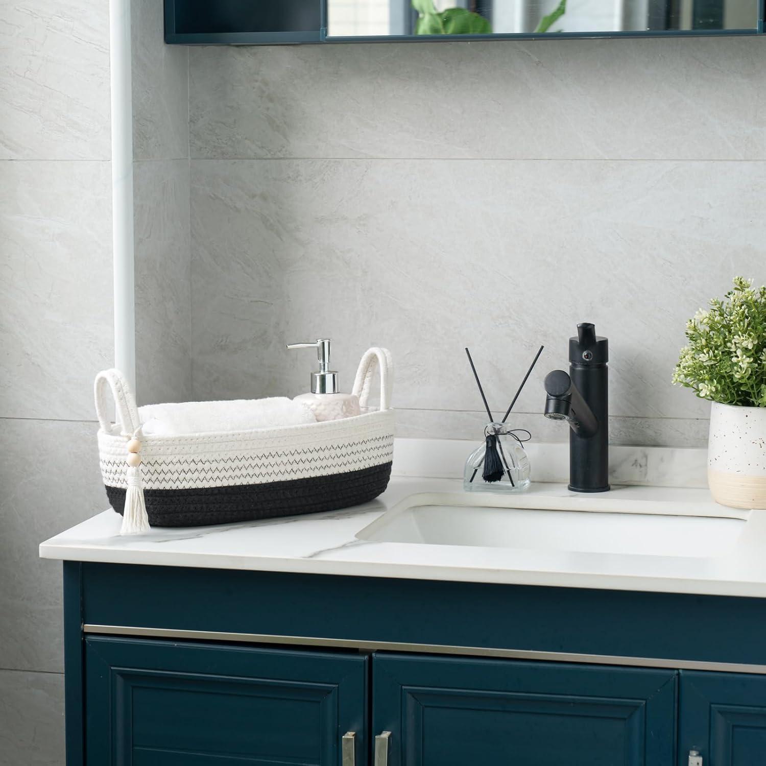 Our black and white bathroom accessories organizer is perfectly designed to hold toilet paper, personal care in the bath, or office essentials, beauty products, hand towels, toiletries, hair supplies, remotes, etc. With sturdy handles design, the storage basket can easy to move and carry.