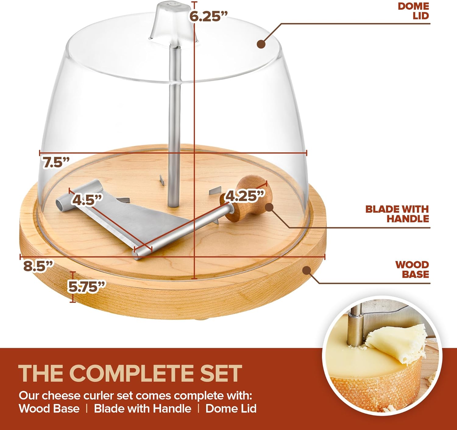 Complete Set: Our cheese curler set is the ultimate ensemble to elevate your favorite hard cheeses and includes a maple wood base 8.5”DIA x 5.75”H, a stainless steel blade 4.5”W x 4.25”H x 1.25”D, and an acrylic dome lid 6.25”H x 7.5”DIA.