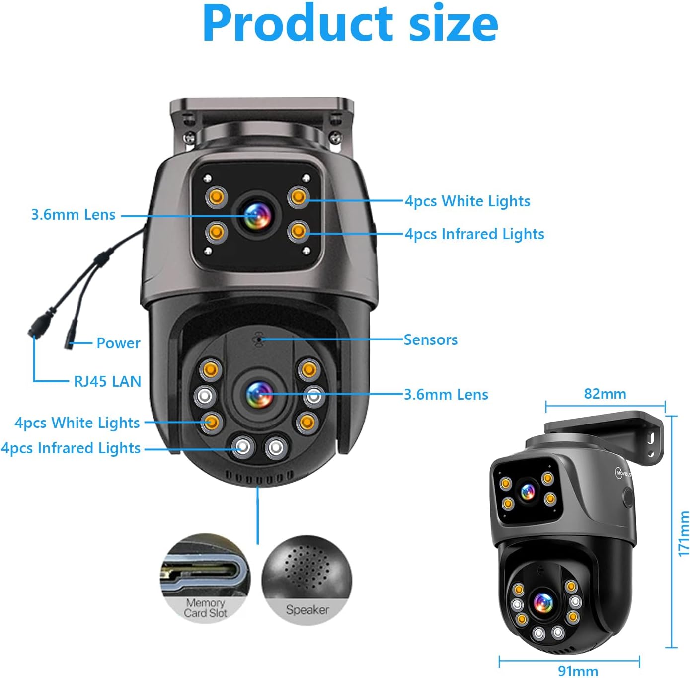 【Dual Lens PoE Security Camera】Movols outdoor PoE security camera with dual 3.6mm lenses: bullet camera and dome camera provide 360° angle coverage and truly dead-angle free 2-screen UHD images.Gives you a long video retention time(maximum supports 128GB TF Card),24/7 recording security camera with non-stop surveillance by this wired security camera.It can work alone or connect with appointed Movols NVR Systems