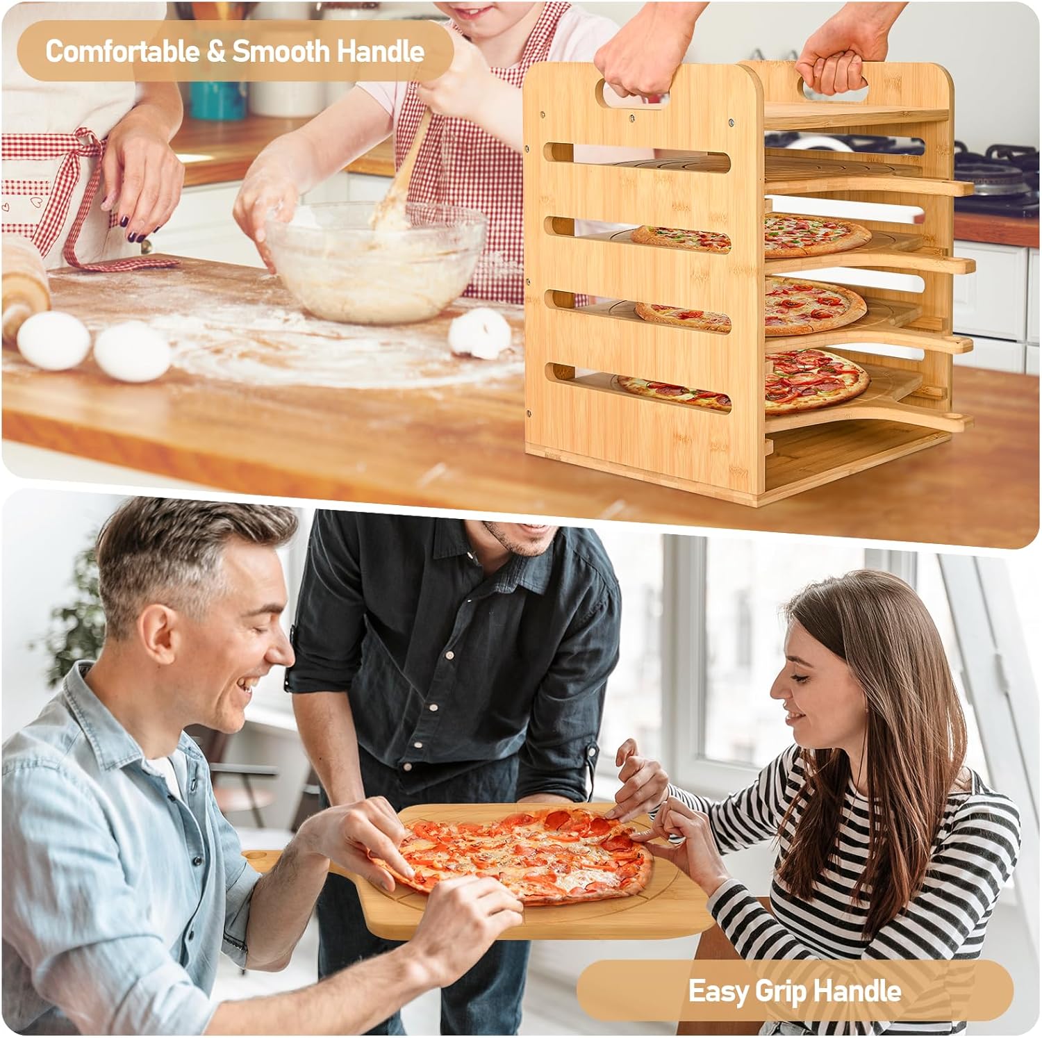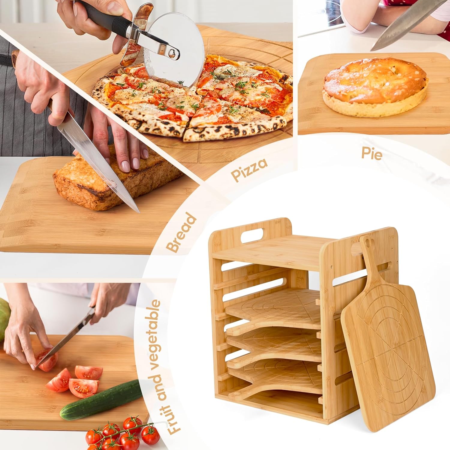 Bamboo Material]- Made of premium bamboo, our pizza racks stand pizza board with handle guarantees durability and ease of use, preventing warping and splintering while providing a smooth, comfortable grip for effortless handling