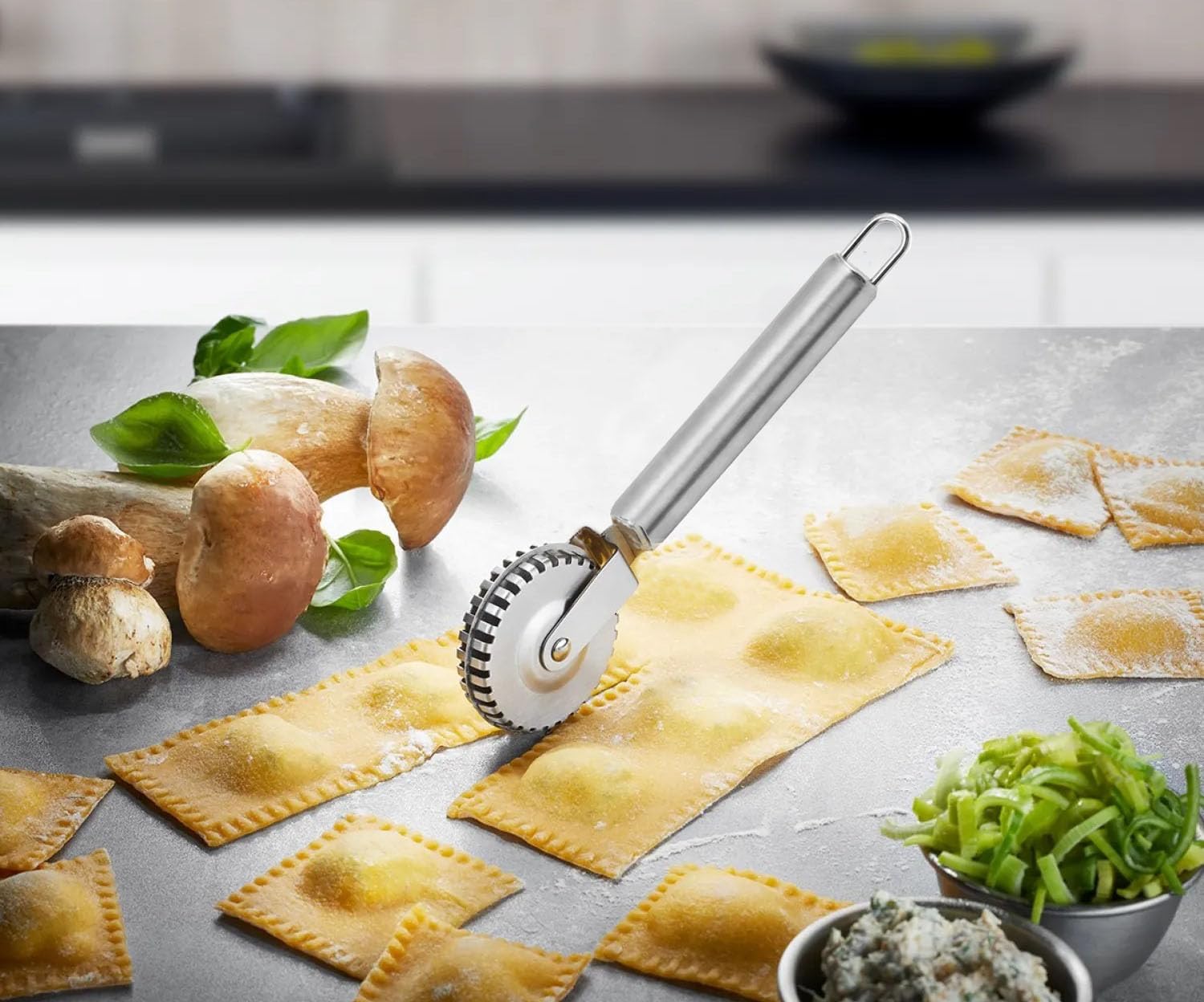 Pasta Cutter & Crimper: Create homemade ravioli, pastries, and pasta with the stainless steel MyHoome cutter. Perfectly seal, crimp and cut ravioli, pierogi, dumplings, and empanadas in one motion.