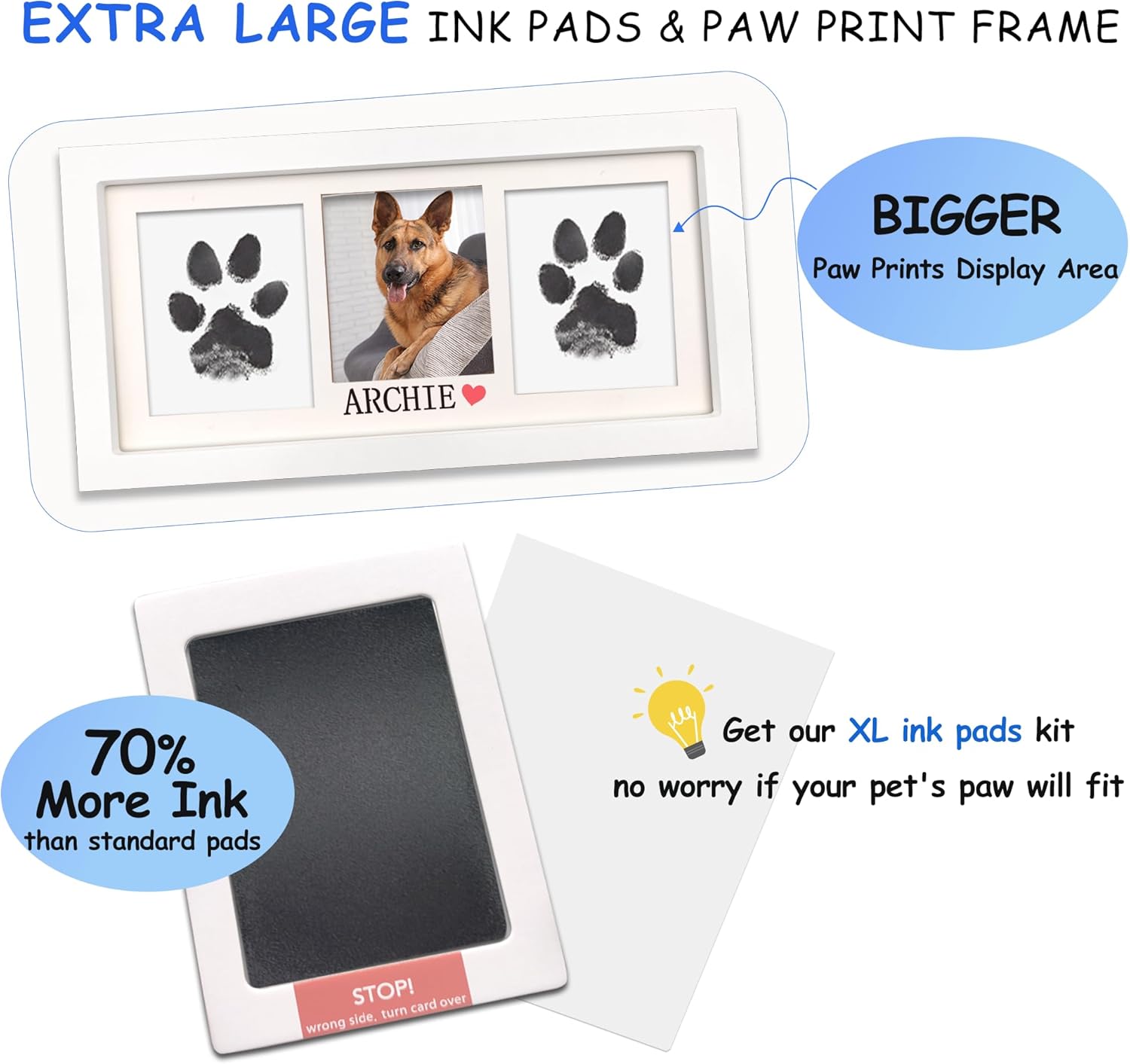 【Extra Large Clean Touch Ink Pads】The pet paw print impression kit uses an ink pad that is non-toxic, puppy and kitten safe, and mess free.Designed to easily stamp pawprints without getting ink on your fur baby.This paw print kit included 2 ink pads for you to record your pet’s perfect paw print! Extra Large ink pads so you don’t have to worry about the fit of your pet’s paws