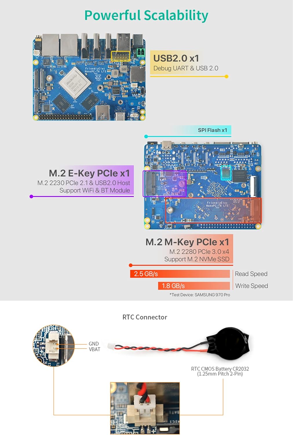 [Rich Hardware Resources] NanoPC-T6 computer router equipped with 1 M.2 B-Key slot, which can be installed and used M.2 NVME solid-state hard disk, and 1 M.2 E-Key slot, which can be installed and used M.2 2230 size WiFi wireless module, and One miniPCIe interface, can install and use 4G LTE module.It also supports booting with TF cards.