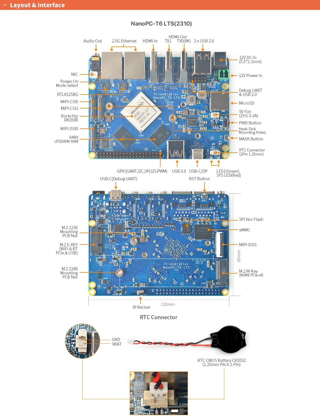 miniPCIe:Support 4GLTE Module with microSIM slot.M.2 M-Key PCle:M.2 2280 PCle 3.0×4, Support M.2 NVMe SSDM.2 E-Key PCle:M.2 2230 PCle 2.1 & USB2.0 Host, support WiFi & BT ModuleOnboard M3 PCB nut for mounting M.2 2230 moduleSPI Flash Socket x1SPI Flash Socket Available for 4GB/8GB ModelSPI Nor Fash Soldered for 16G RAM Modele