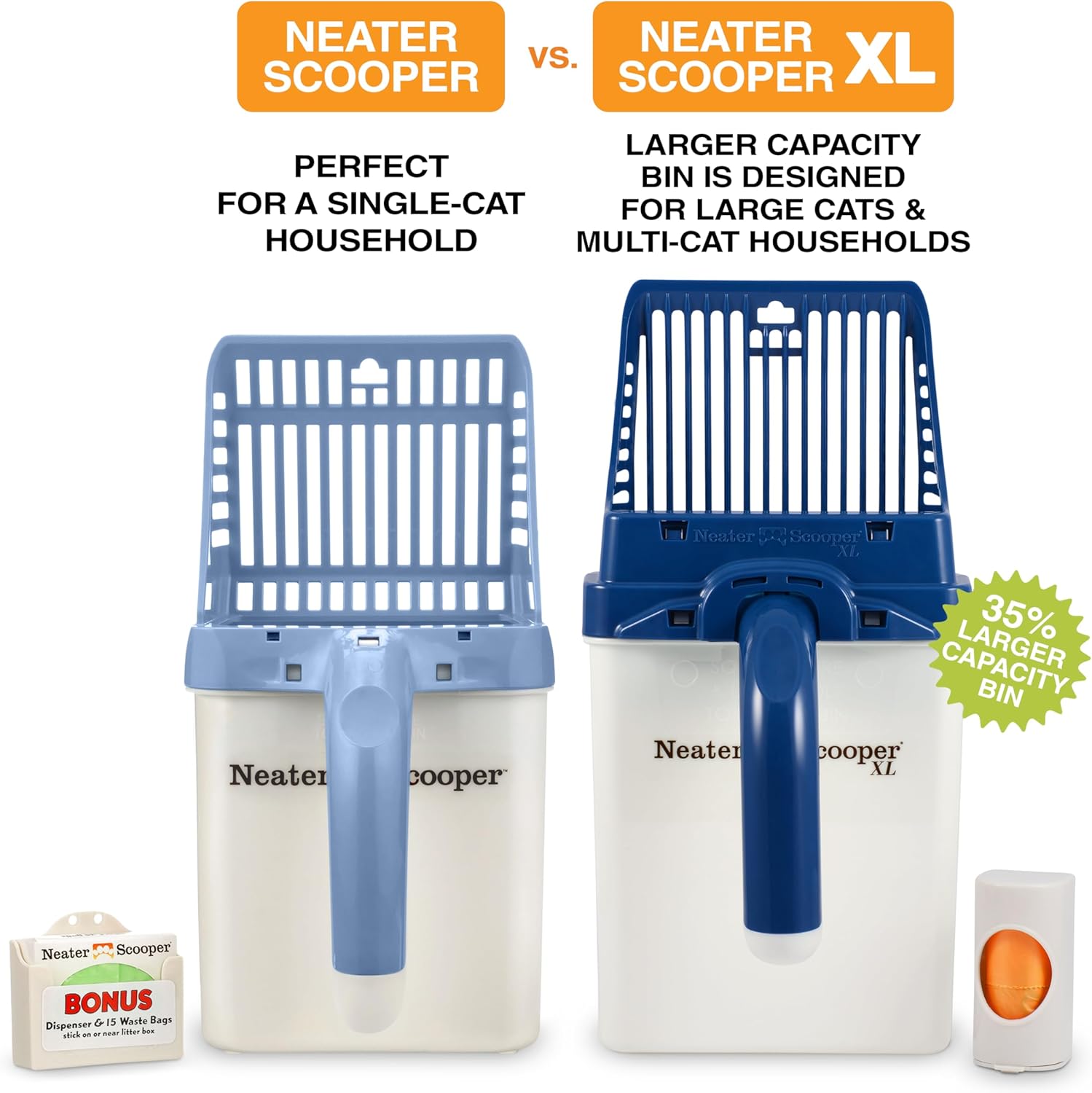 LARGE CAPACITY, QUICK SIFT DESIGN, & WIDE OPENING: Neater Scooper XL cat scooper for litter box holds 35% more waste than the standard Neater Scooper, making it ideal for multi-cat households or large cat breeds. Its quick-sift design filters out clumps with minimal shaking, reducing dust and litter waste. The wide opening easily accommodates larger clumps.