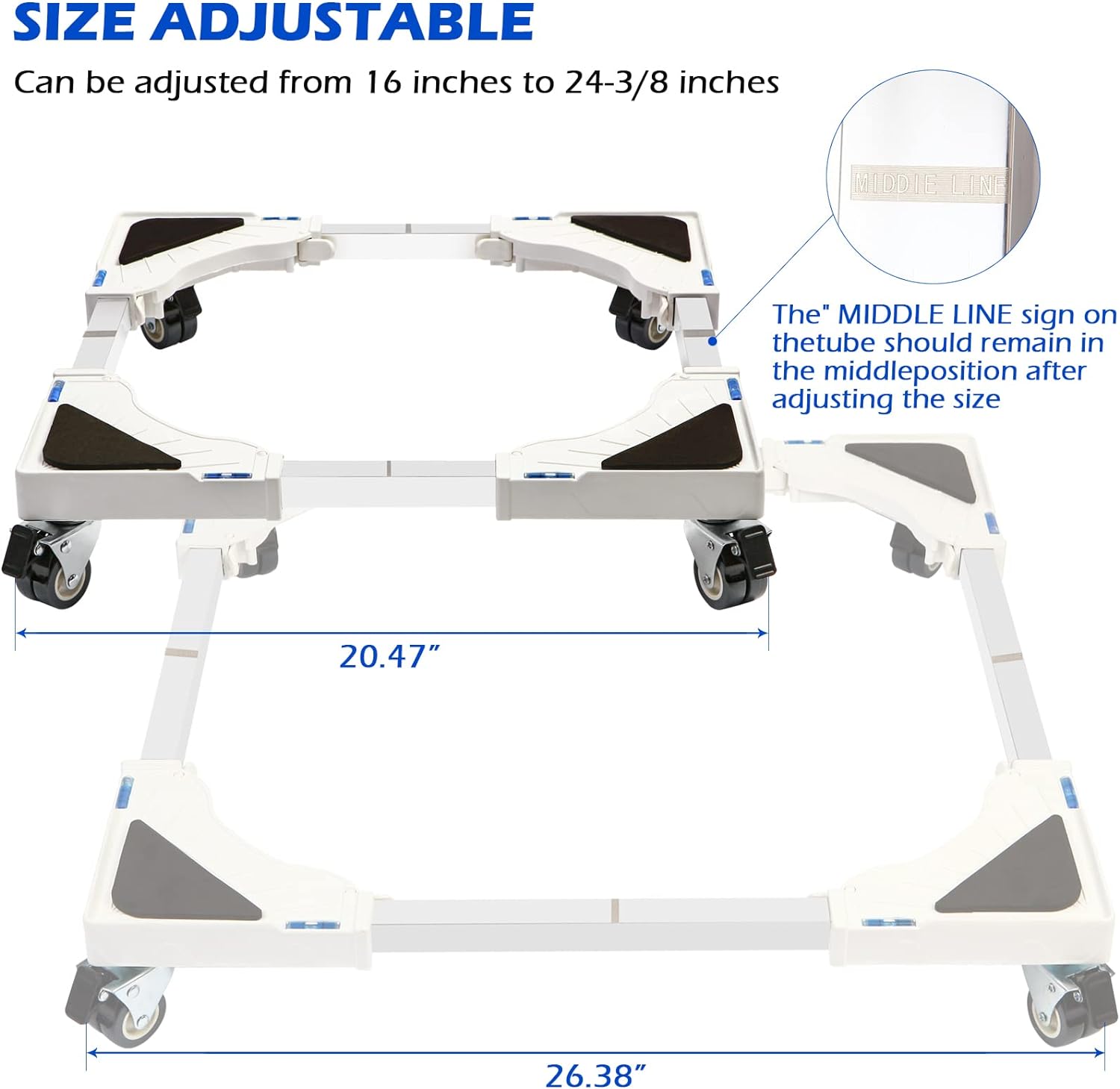 Adjustable Size: With adjustable steel poles, Nefish black appliance dolly base can be adjusted from 16 inches to 24-3/8 inches, fit different appliances and furniture. (Note: Pls let The ” MIDDLE LINE” sign on the tube remain in the middle position after adjusting the size)