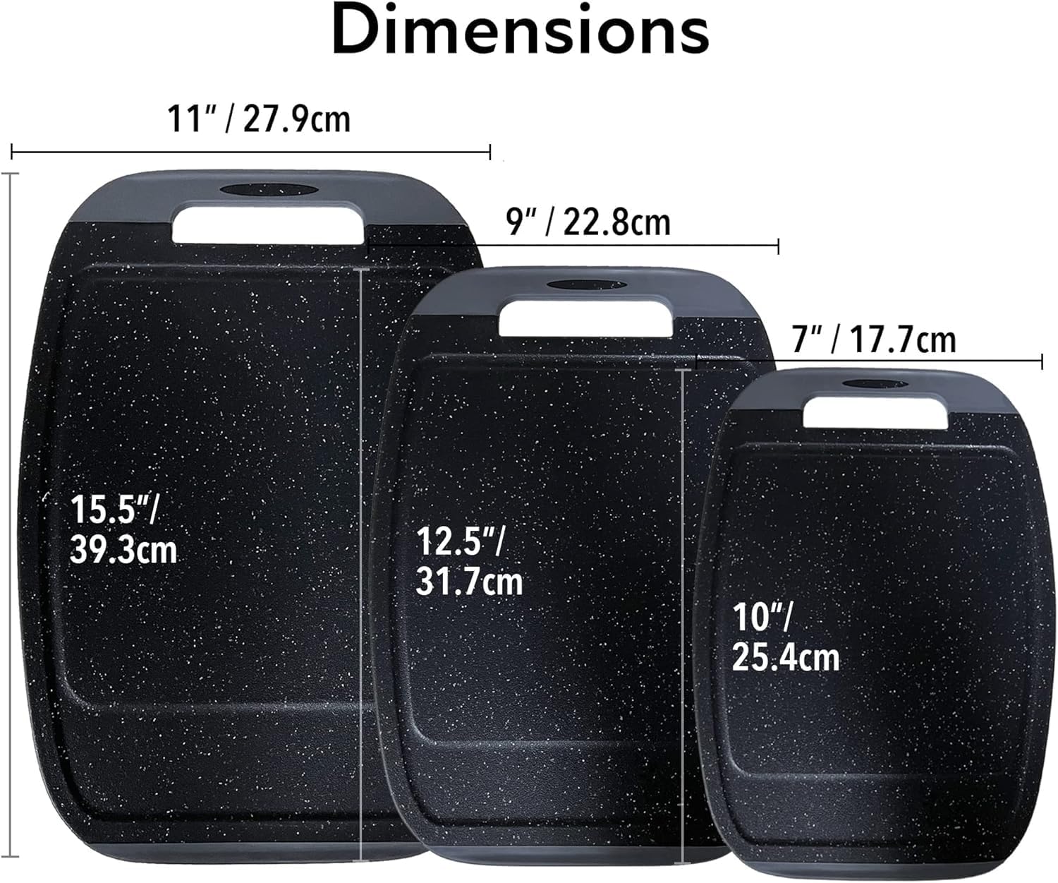 This cutting board set incldues 15.5″ X 11″ , 12.5″ X 9″ and 10″ X 7″ Boards.