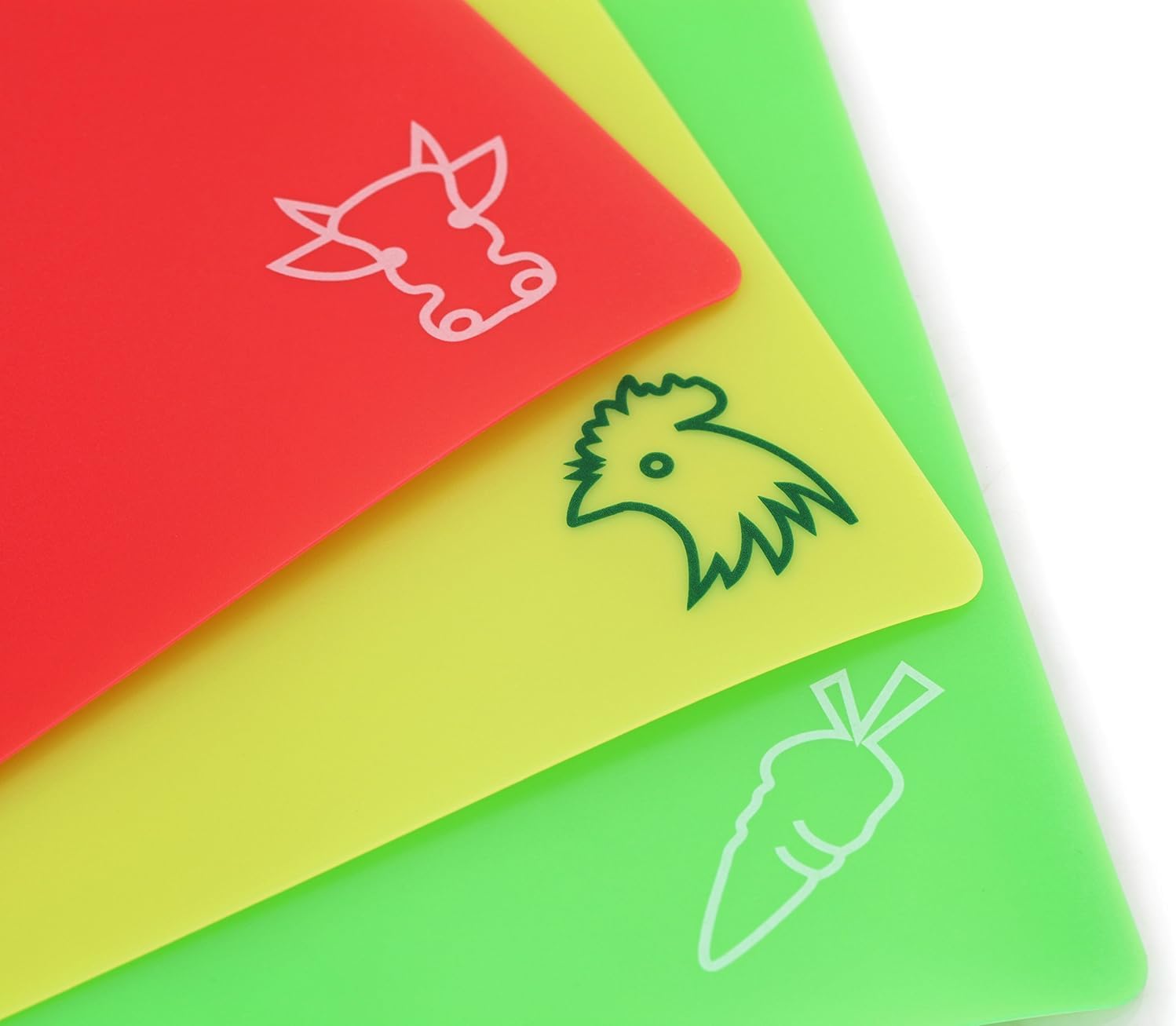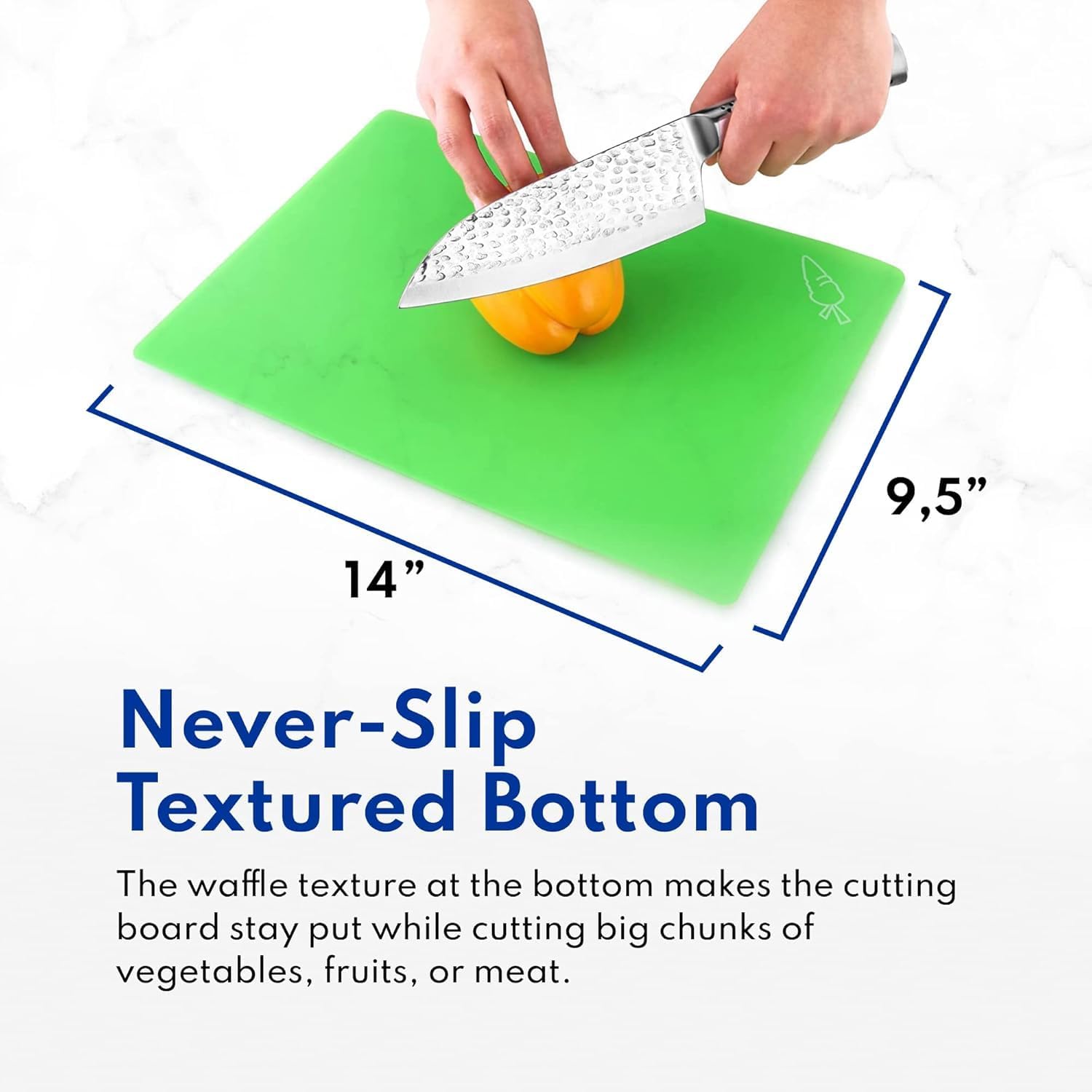 Customers find the cutting boards well-made and appreciate their thickness, noting they’re thick enough not to cut through easily while being lightweight. They are easy to clean, with customers mentioning they can be put in the dishwasher with no issues, and feature color coding that helps prevent cross contamination. The boards are praised for their size, taking up minimal space when stored and fitting in dishwashers, and customers find them perfect for cutting, with knives cutting easily on them. The flexibility receives mixed feedback, with some finding them flexible enough for kids while others say they’re too rigid.