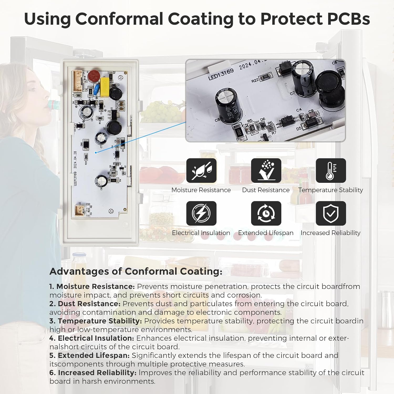 Moisture Resistance: Prevents moisture penetration, protects the circuit board from moisture impact, and prevents short circuits and corrosion.Dust Resistance: Prevents dust and particulates from entering the circuit board, avoiding contamination and damage to electronic components.Temperature Stability: Provides temperature stability, protecting the circuit board in high or low-temperature environments.Electrical Insulation: Enhances electrical insulation, preventing internal or external short circuits of the circuit board.Extended Lifespan: Significantly extends the lifespan of the circuit board and its components through multiple protective measures.Increased Reliability: Improves the reliability and performance stability of the cir cuit board in harsh environments.