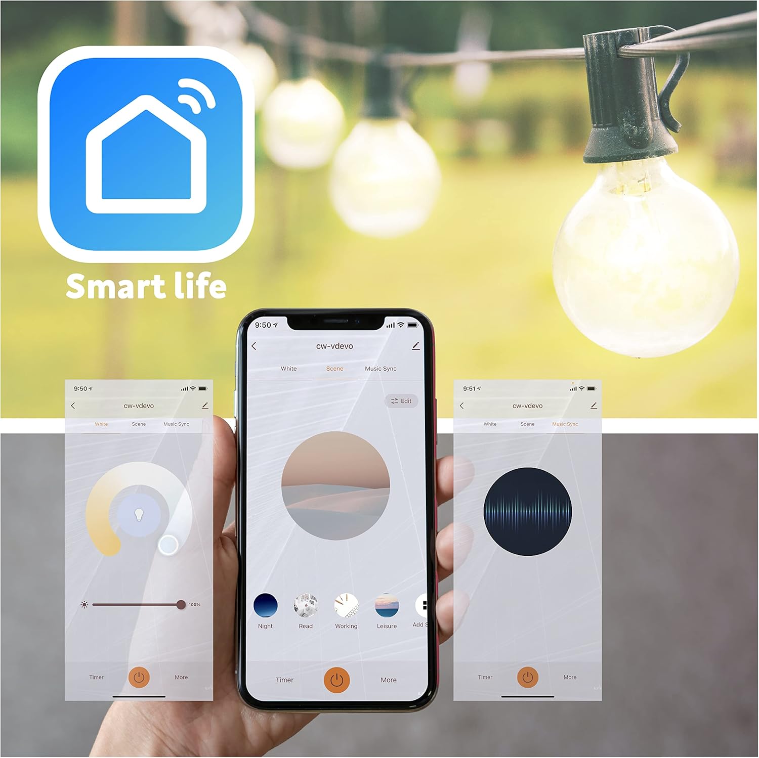 SMART APP-CONTROLLED LIGHTS: Easily access your outdoor string lights from anywhere, using just your phone or tablet via the free Smart Life app. You can sit back and enjoy the added convenience and efficiency of being able to dim the brightness, set up automatic timers and lighting schedules, or just simply turn your lights on and off, all without having to get up or install a light switch.
