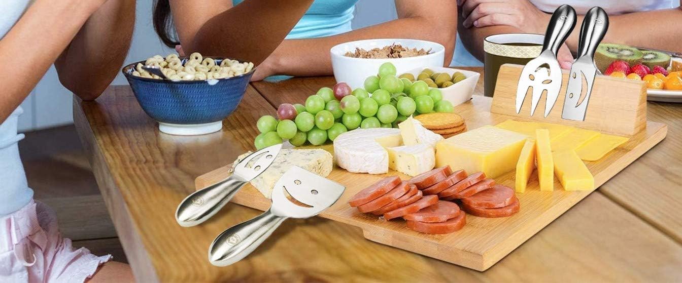 NewlineNY Stainless Steel Premium Smiling Faces Cheese Knife Set. 4 Pieces set includes: Hard Cheese Knife, Serving Fork, Soft Cheese Knife & Cheese Spreader 18/10 Stainless steel; Easy for cleaning & dishwasher safe.