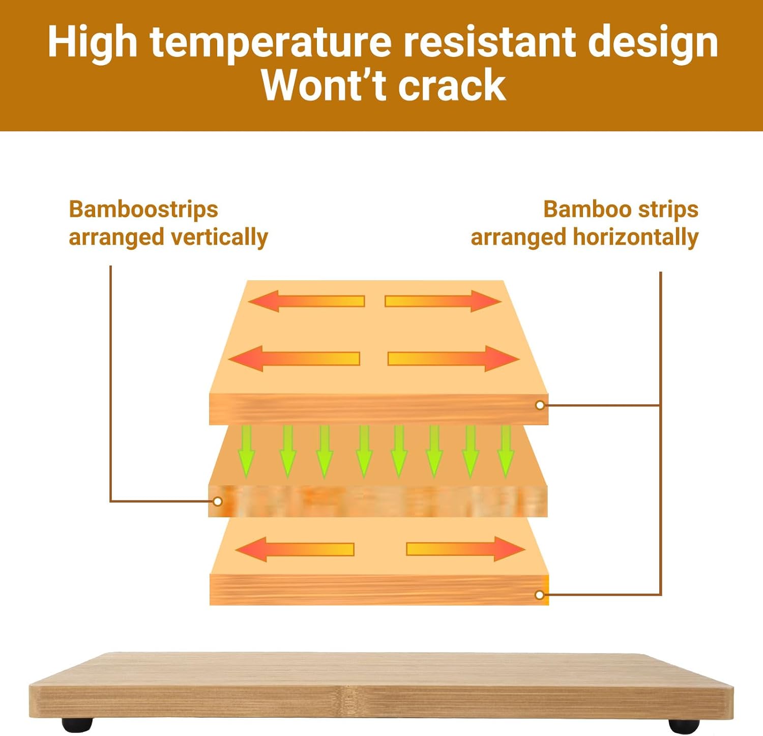 Made of durable bamboo wood, this cutting board measures 45 x 29.5 x 3cm (17.71 x 11.61 x 1.18 inches) and provides ample storage space for your organisational needs. Equipped with 4 chopping board feet on the back, it is able to elevate the chopping board to avoid damage caused by direct contact with the oven, while ensuring stable placement and preventing sliding. The handles on both sides are designed to make handling easier and save time and energy.