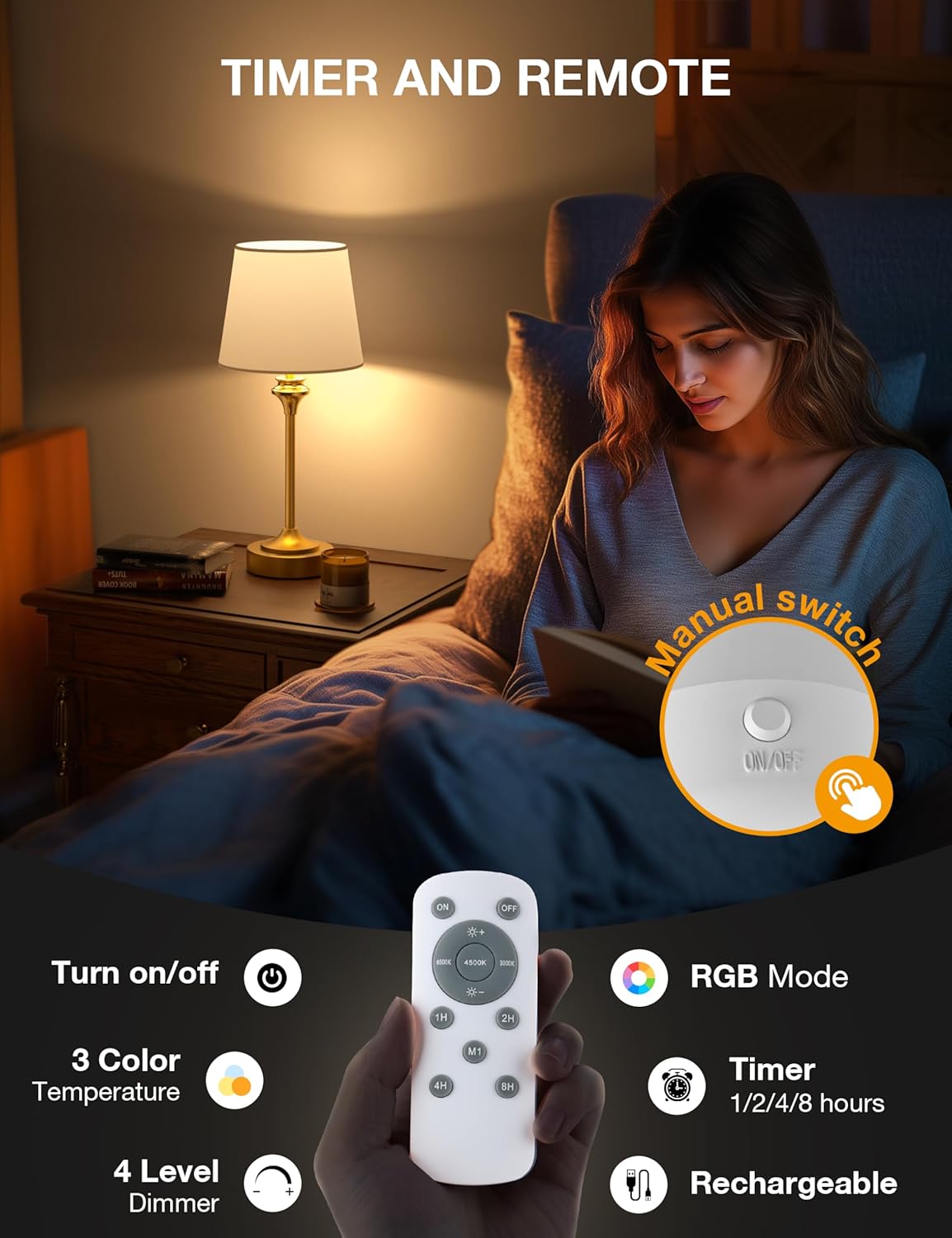 Multiple modes, smart memory:Our wireless light bulbs offers three adjustable color temperatures (3000K, 4500K, 6000K) and four brightness levels (25%-50%-75%-100%), allowing you to create the perfect atmosphere. Additionally, cordless light bulbs for lamp offer 6 RGB color options to meet your personalized lighting needs. The smart memory function remembers your last settings, providing you with the most comfortable lighting experience at any time