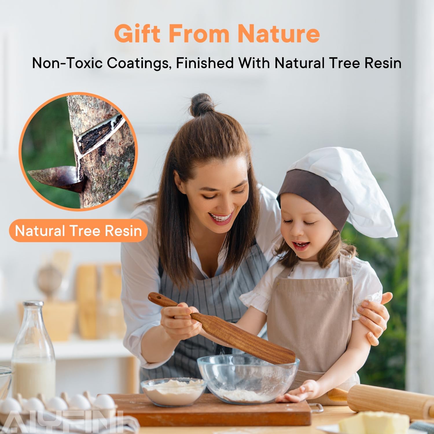 CERTIFIED NON-TOXIC & FOOD-SAFE: Tested by SGS and compliant with FDA standards, Alyfini wooden utensils are made from a single solid piece of acacia wood—no glue, no joints, and no mineral oil coatings. Unlike silicone utensils, our utensils are treated with food-grade natural tree resin base—BPA-free, moisture-resistant, and completely safe for your family