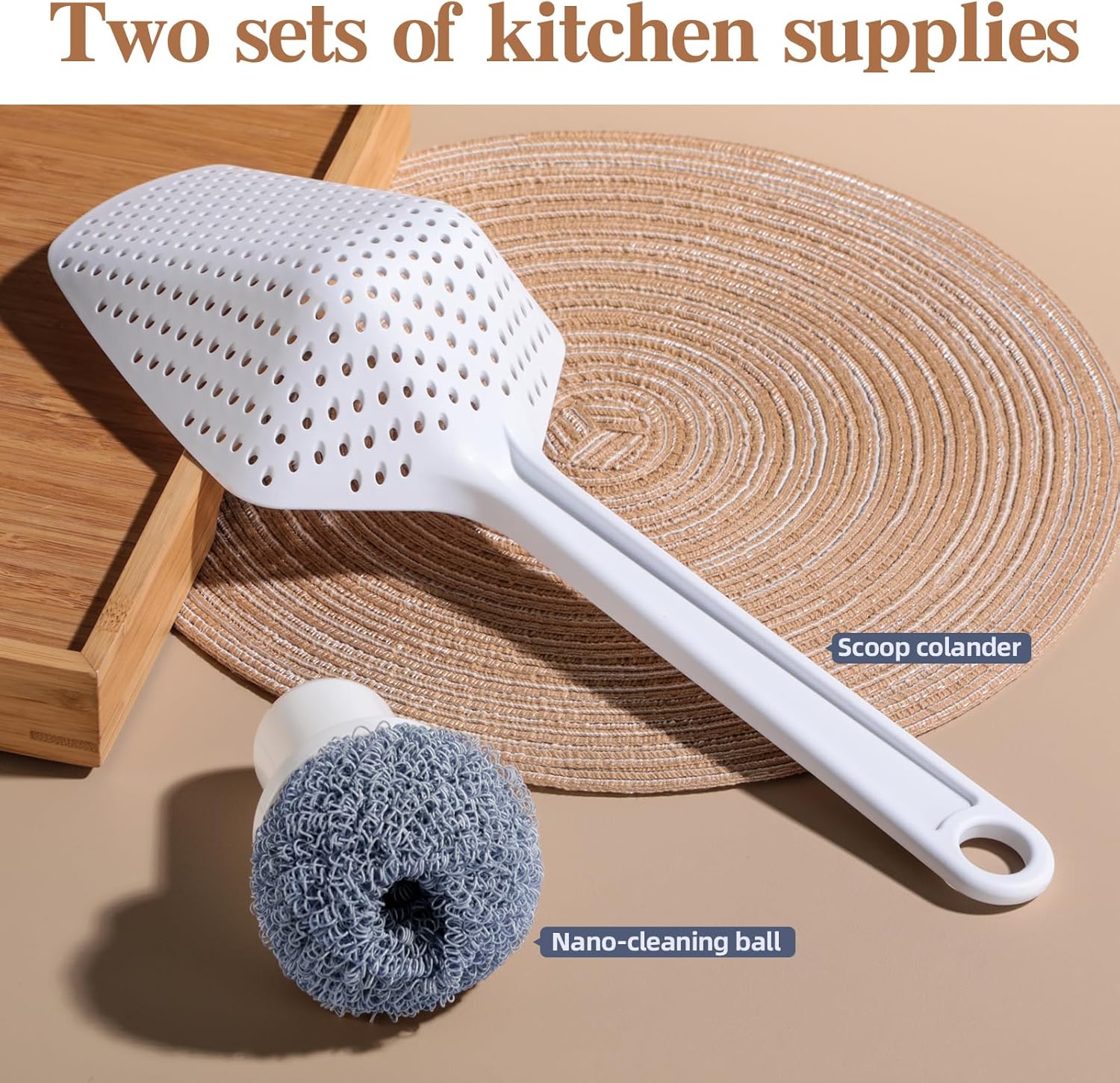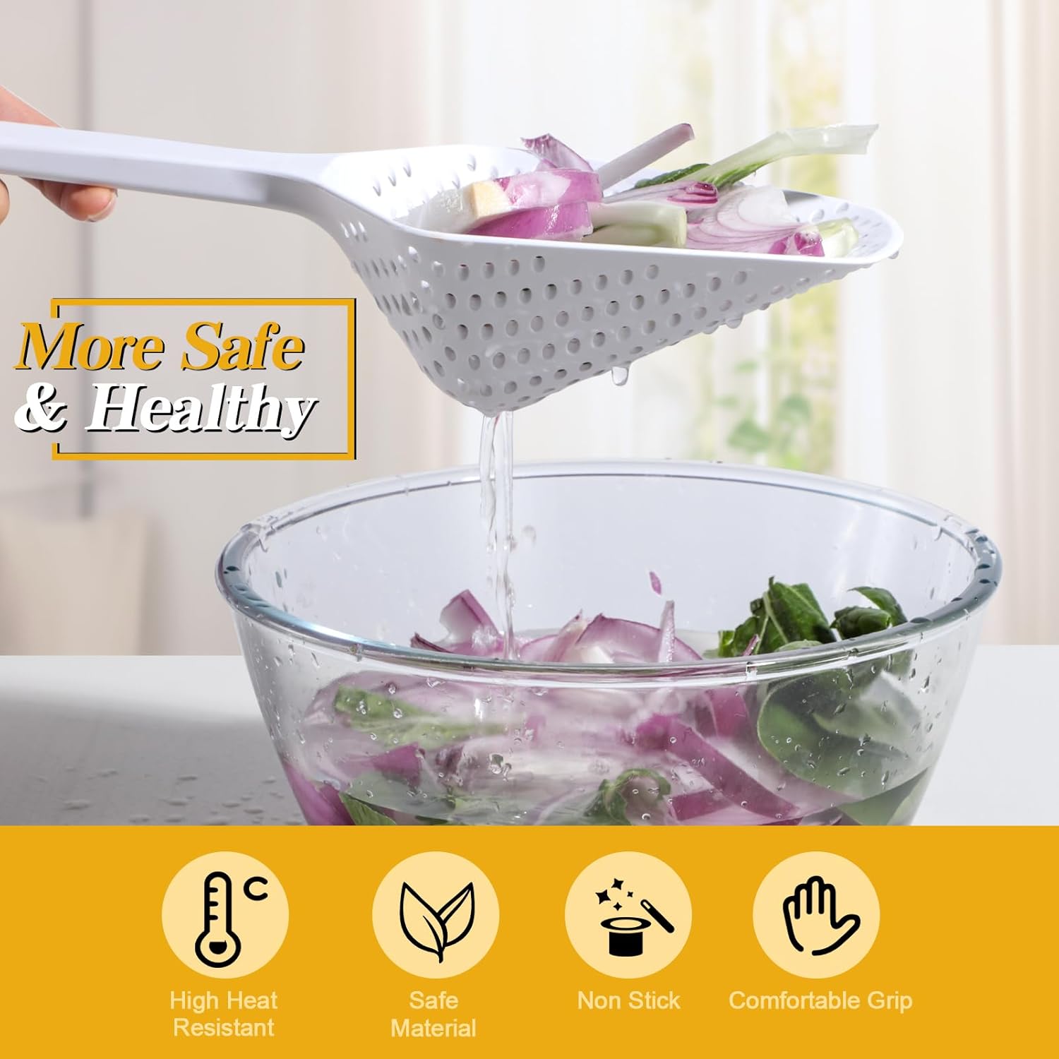 NVTED Strainer Scoop Colander, Food Strainer Slotted Spoon Long Handle with Nano Cleaning Balls, Plastic Heat-Resistant Large Slotted Strainer and Skimmer for Pasta, Vegetables, Salad