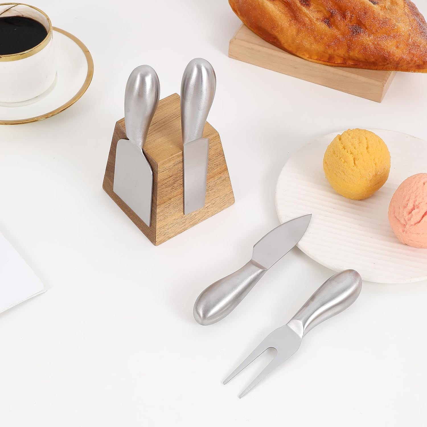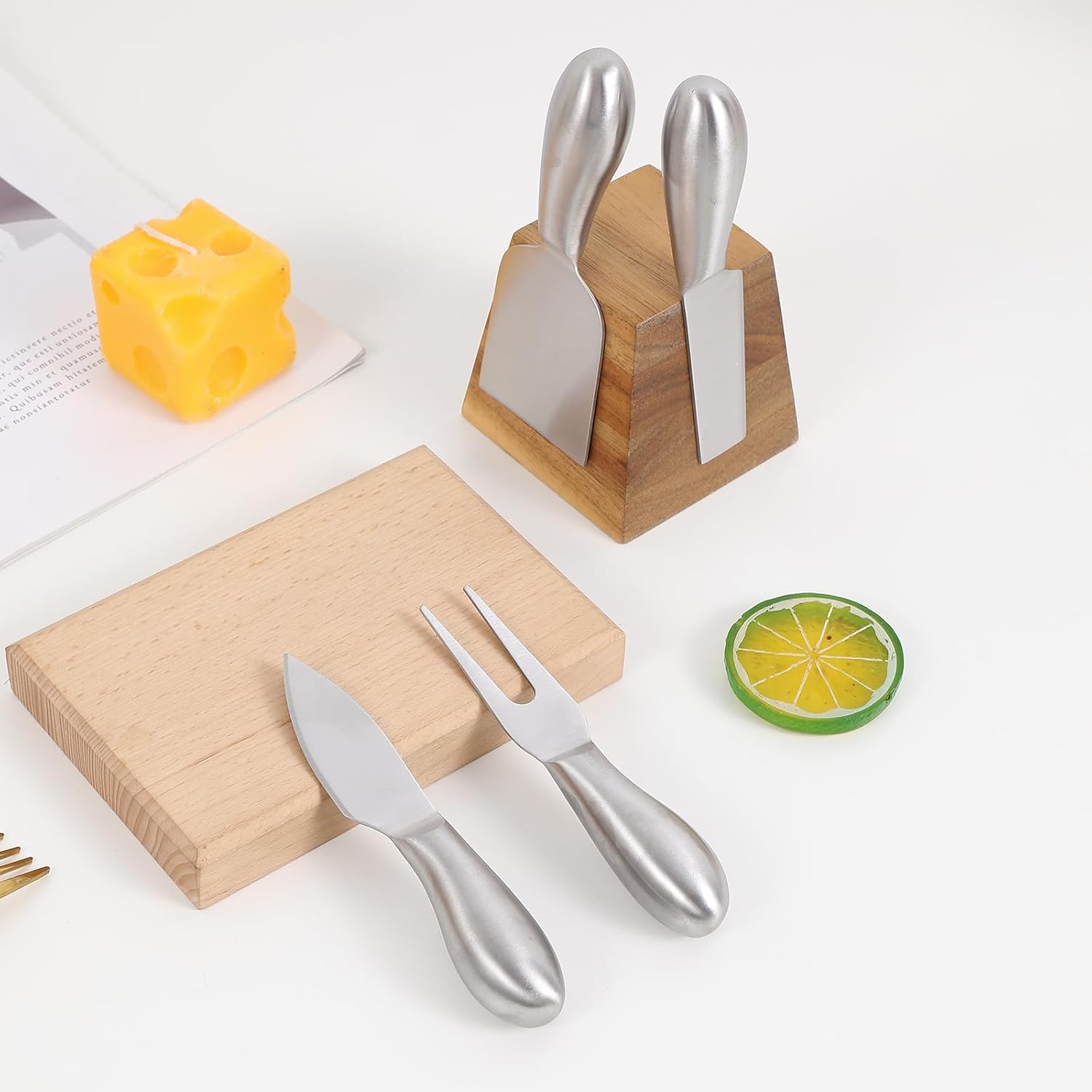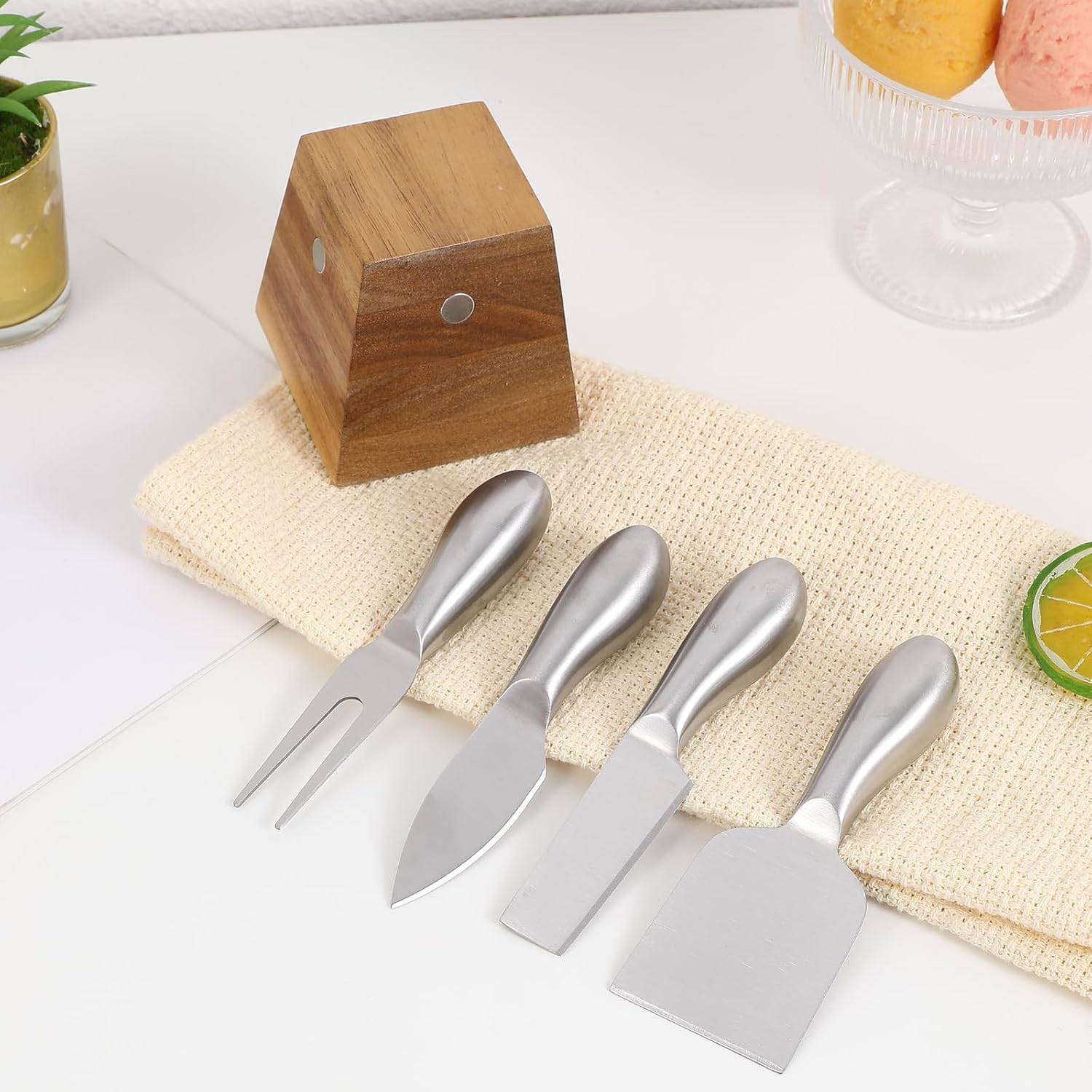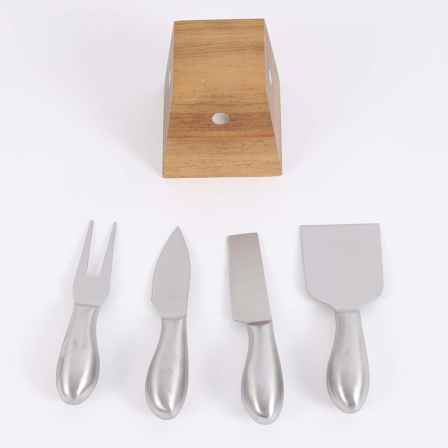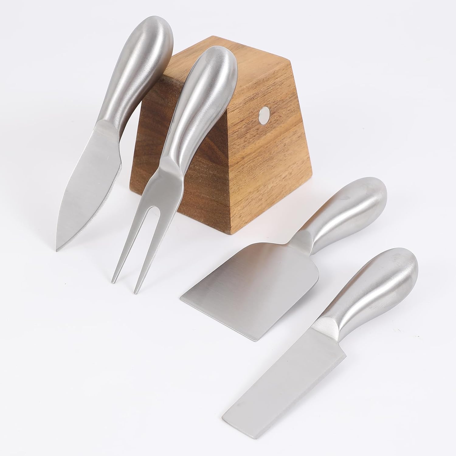 Includes: The cheese knives set/cheese knife set, 1 semi heart knife for spreading cheese, 2 rectangular shapes for slicing and spreading, 1 prong fork for serving, and 1 magnetic knife stand made of all-natural acacia wood