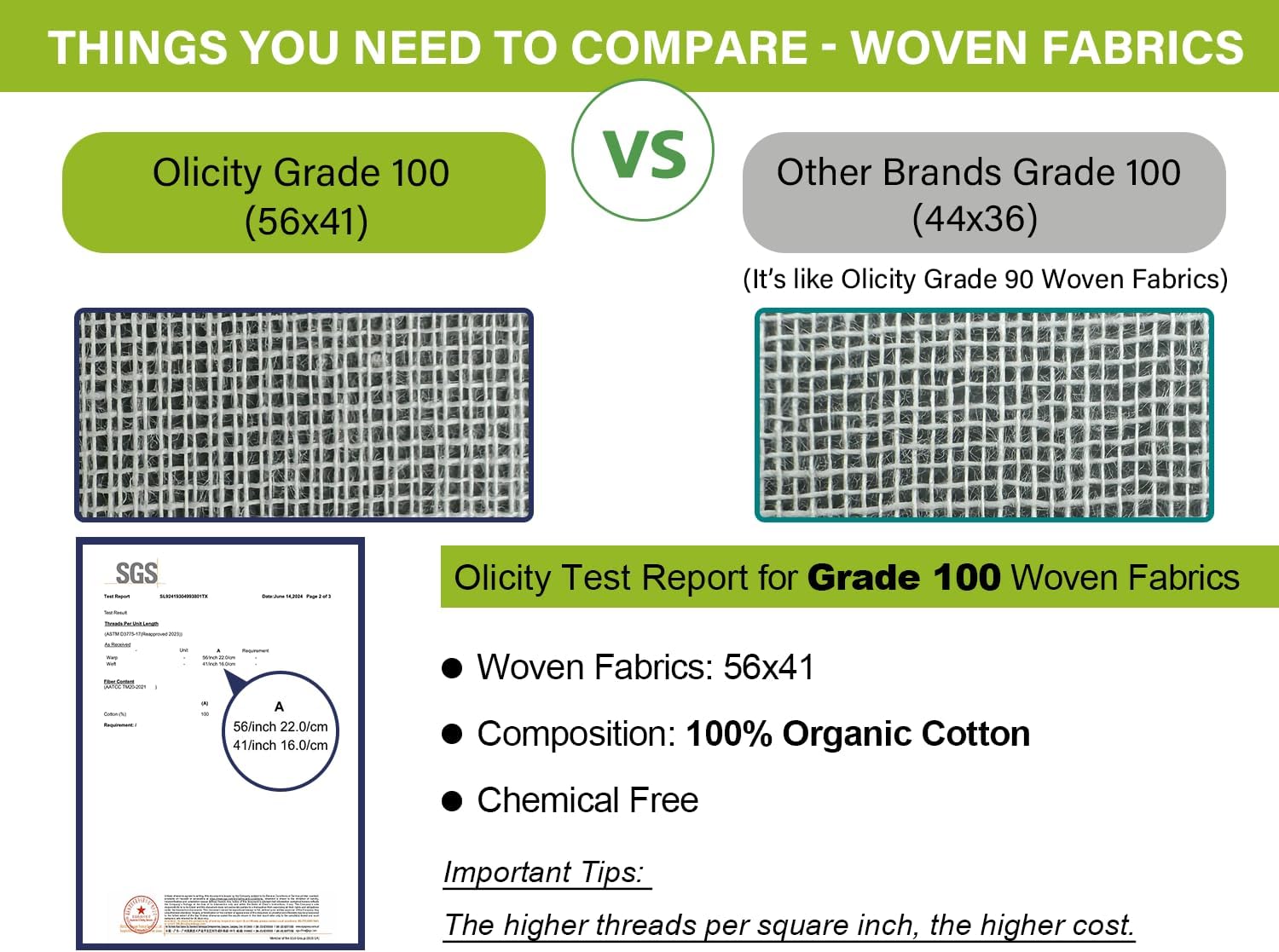 SGS Tested Grade 100 – Our woven fabrics is 56×41. Didn’t reduce threads. No Easy to Tear – The higher threads per square inch, the higher cost. You got what you pay.