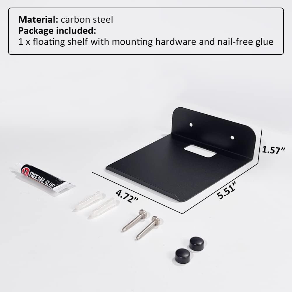 FLOATING & WALL MOUNT DESIGN: Floating metal shelf offers strong load-bearing capacity to stably hold your monitor, speaker or camera. Middle hole is convenient for the arrangement and storage of multiple cables whilst front slightly raised baffle effectively blocks your devices from falling down. Rounded corners and sleek surfaces with no burr will not stab your delicate hands. Come with mounting hardware and nail-free glue to provide you 2 different wall installation methods.