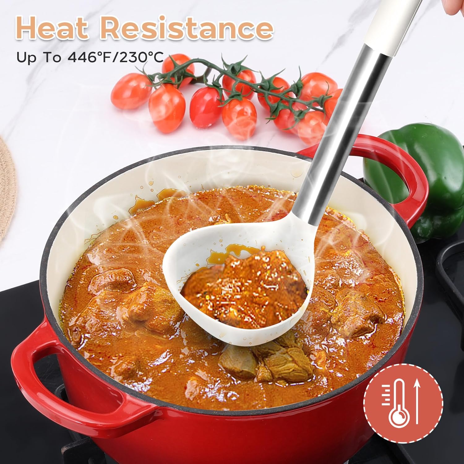 Heat-resistant: this BPA-free silicone utensils set can withstand temperatures up to 446°F, will not melt when stirring food, and the stainless steel handle stay cool to the touch during cooking, preventing burns and ensuring a secure grip