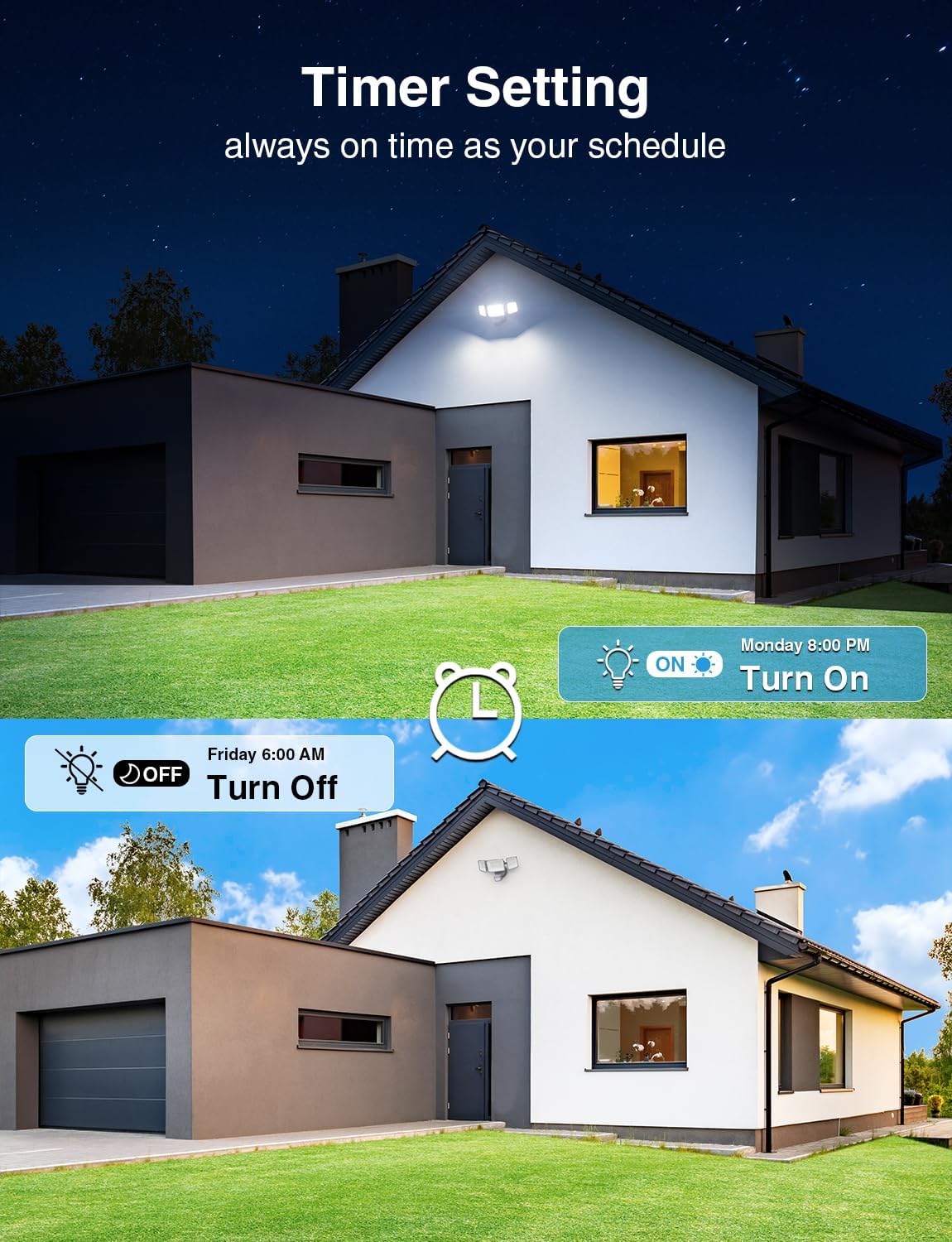 Timmer Setting: Set your specific time schedule, it can work as an ordinary security flood light or motion sensor flood light in different periods according to your settings. Here offer 2 Timing options: 1. Turn on/off automatically in your daily scheduled time. (Ex: 6 PM to turn, 5 AM to off) 2. Turn on/off with different color temperatures or brightness for Specific several hours