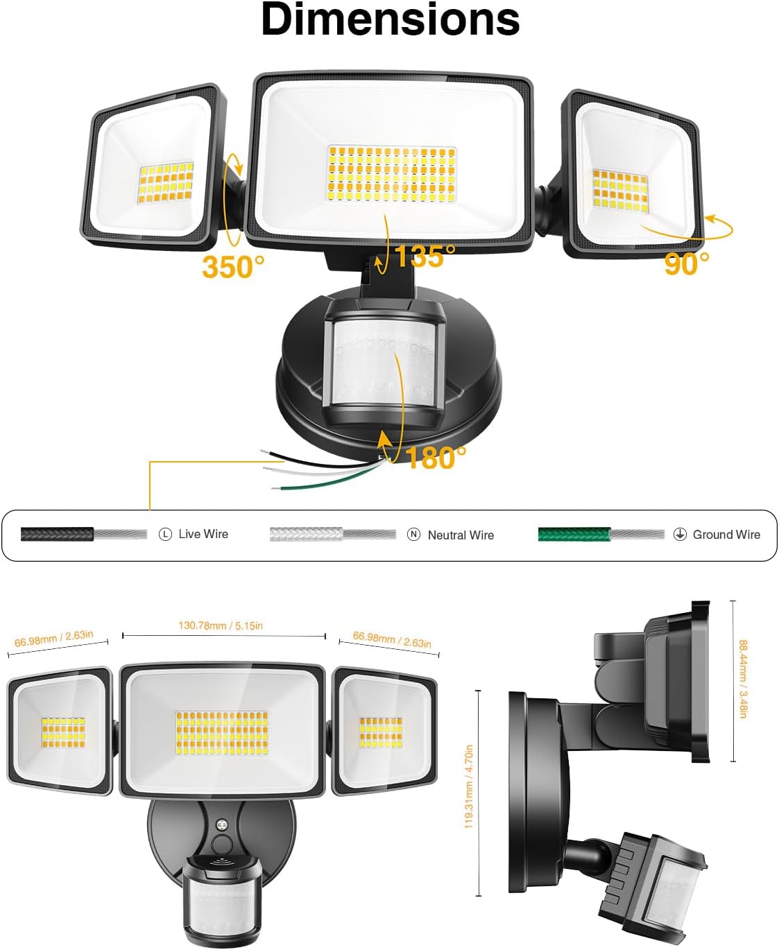 Adjustable Color Temperature & Brightness: The security lights motion outdoor use unique adjustment design— STEPLESS DIMMING system, based on 3 basic color temperatures of warm white – daylight – cold white, and 5-level brightness, offering a wider range of color temperature changes; The security lights are also equipped with memory function, always meeting your need for any occasion