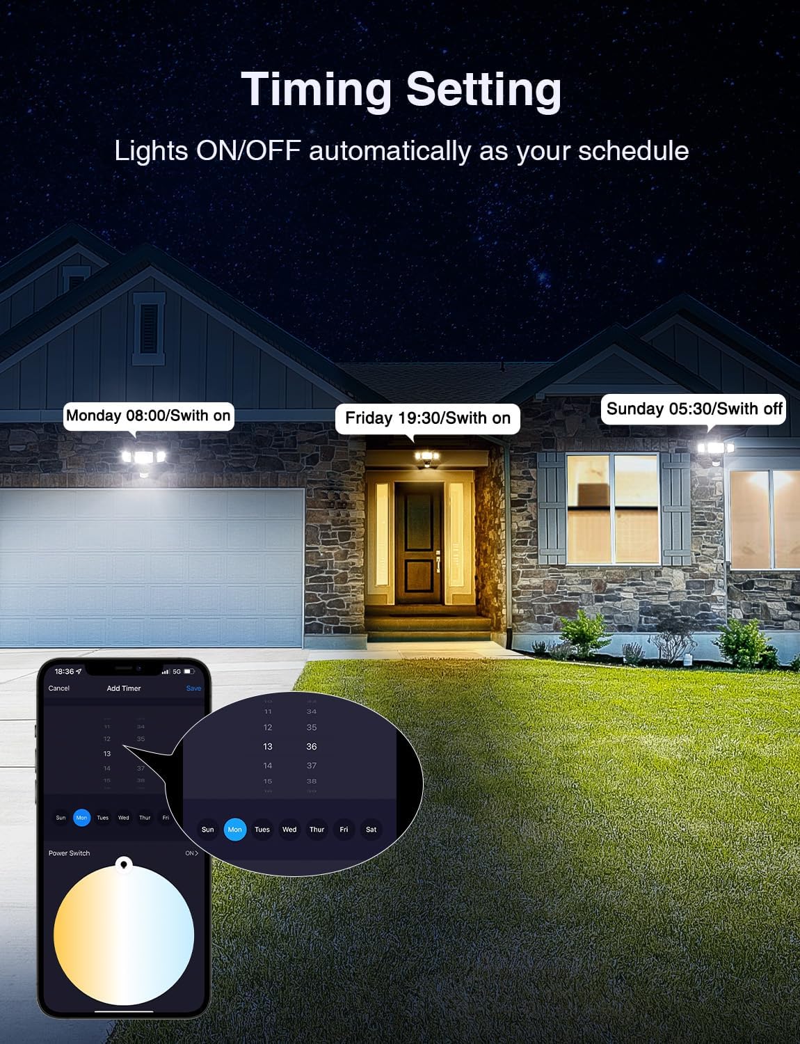 Timmer Setting: Set your specific time schedule, it can work as an ordinary led flood light or motion sensor flood light in different periods according to your settings; Here offer 2 Timing options: 1. Turn on/off automatically in your daily scheduled time; (Ex: 6 PM to turn, 5 AM to off) 2. Turn on/off with different color temperatures or brightness for Specific several hours
