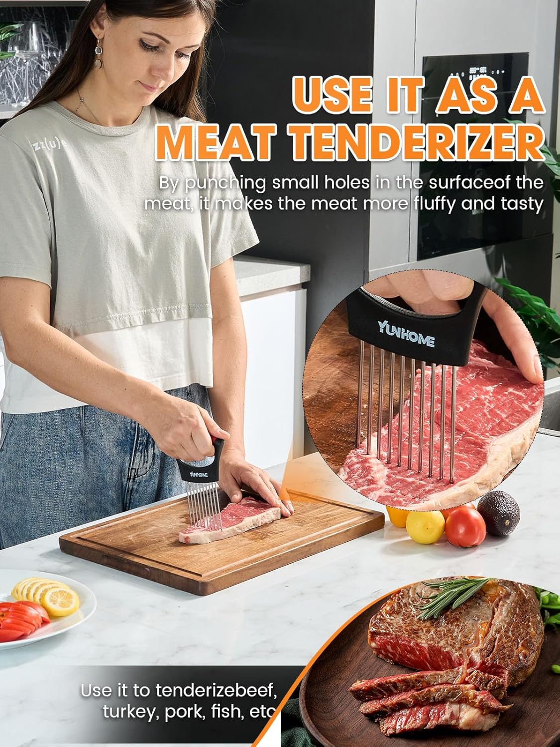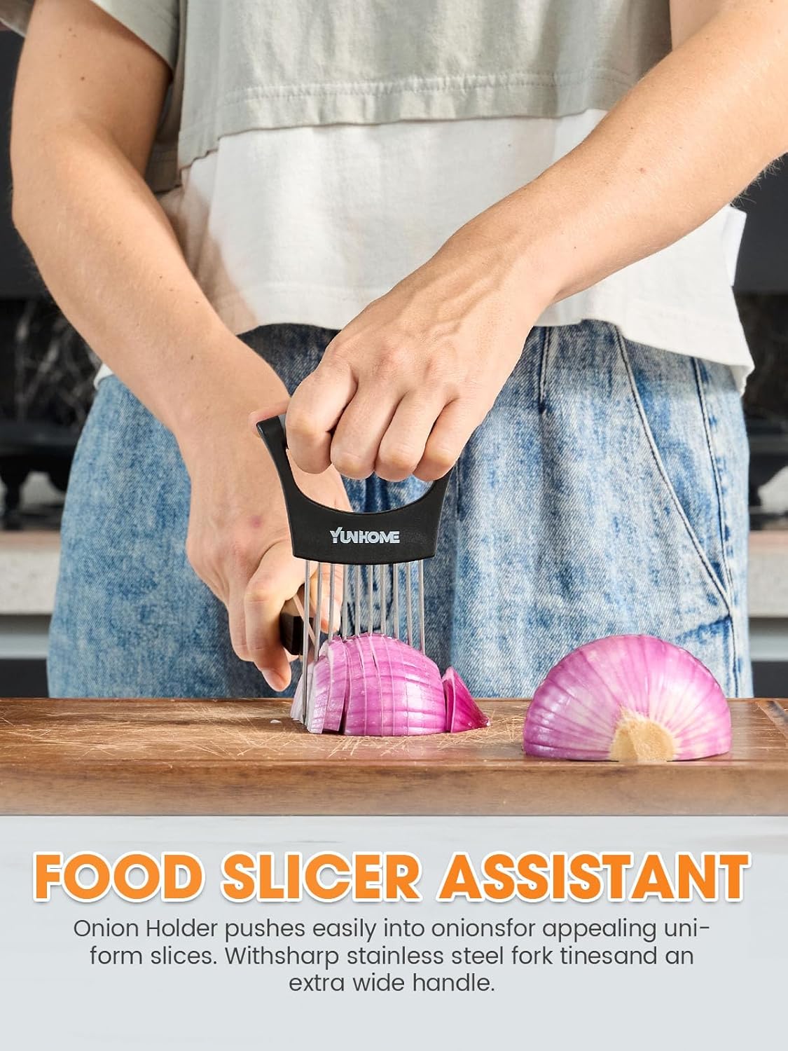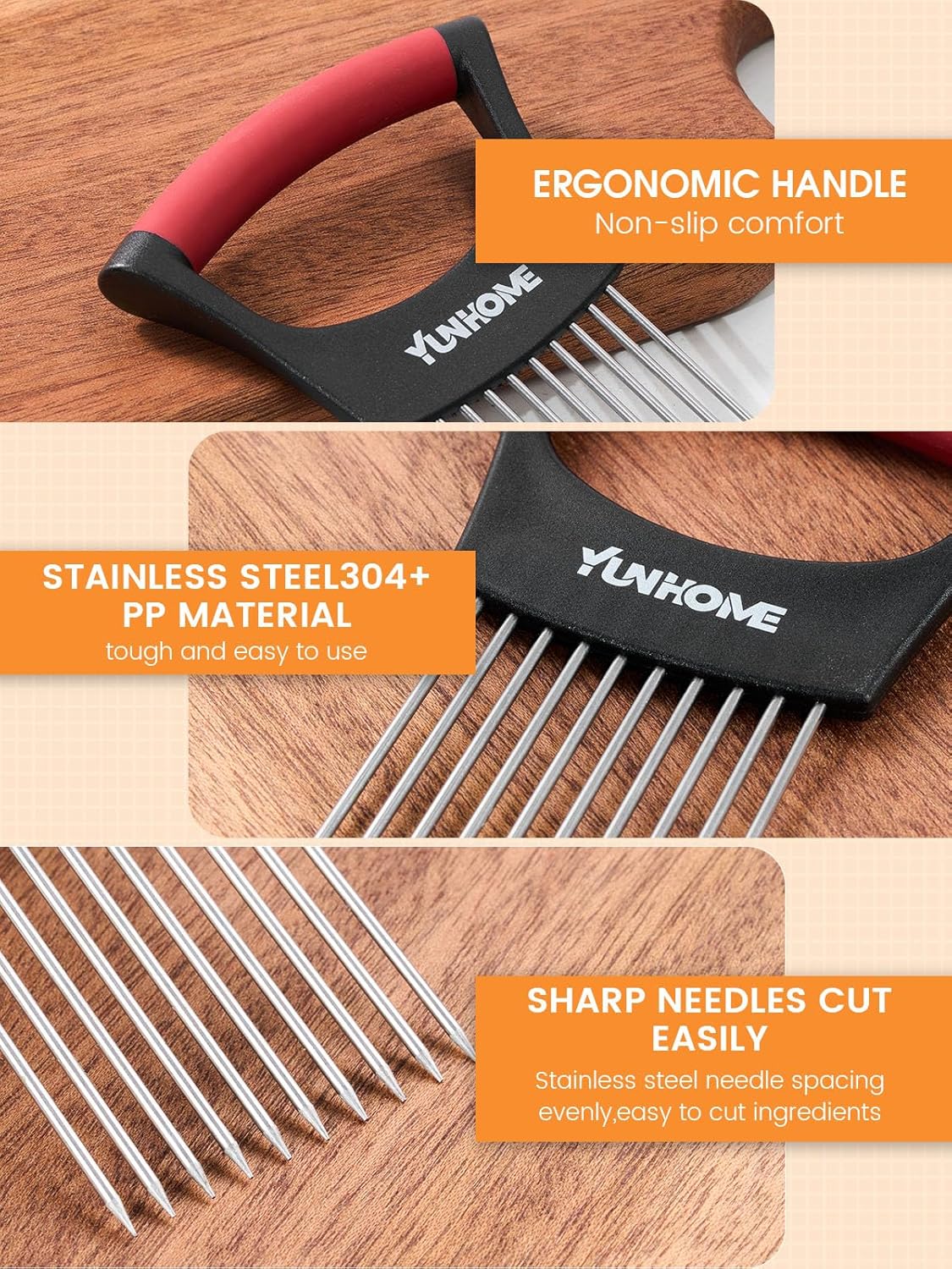 Multifunctional Slicer Tool: YUNHOME Onion Holder Slicer features a unique design with 10 stainless steel forks under the handle, ensuring a secure grip and preventing slippage while cutting. It allows for even and precise slicing of onions, tomatoes, lemons, and meats. Offering a one-stop solution for your slicing needs.The design promotes uniform slicing, enhancing the presentation of your dishes and ensuring even cooking for a professional touch