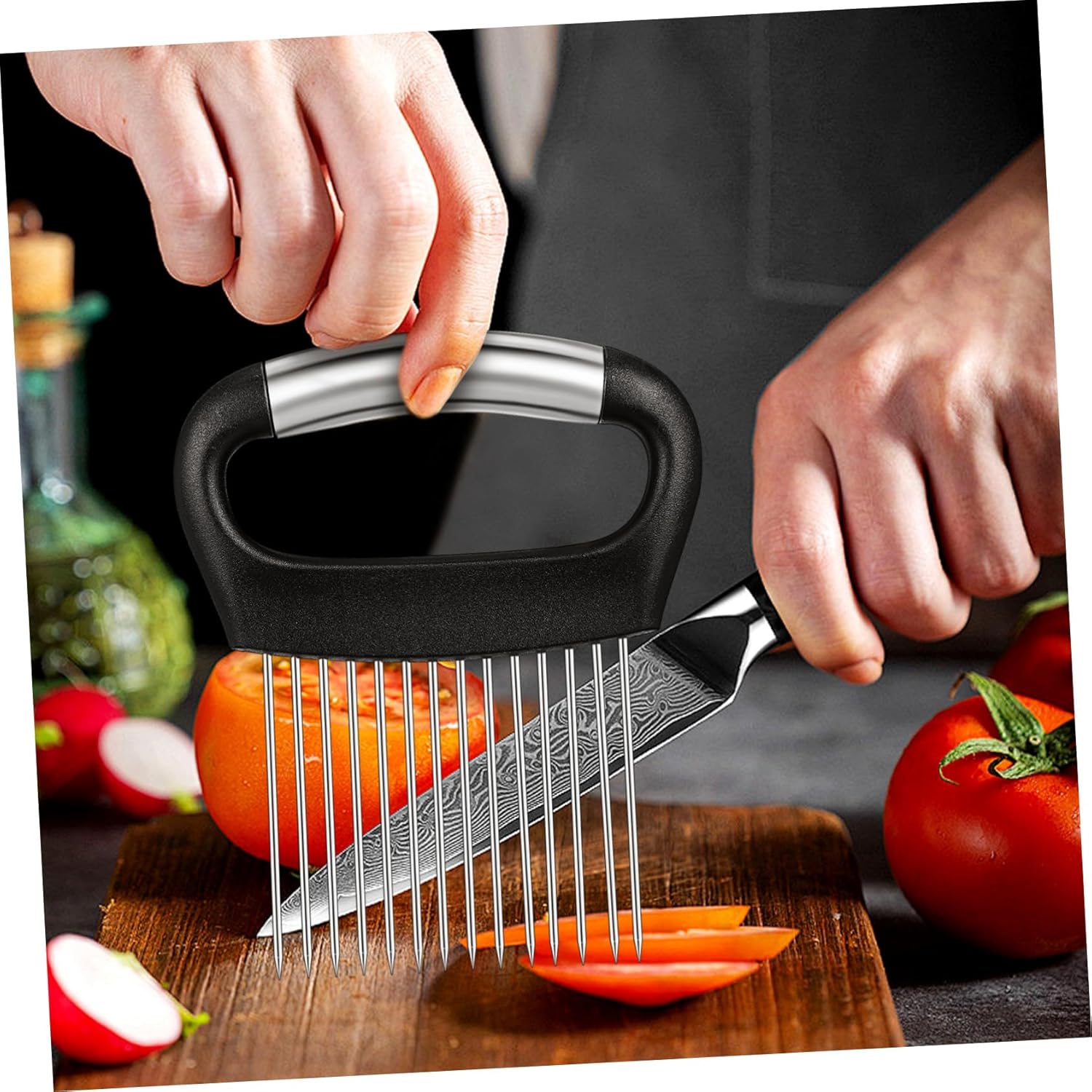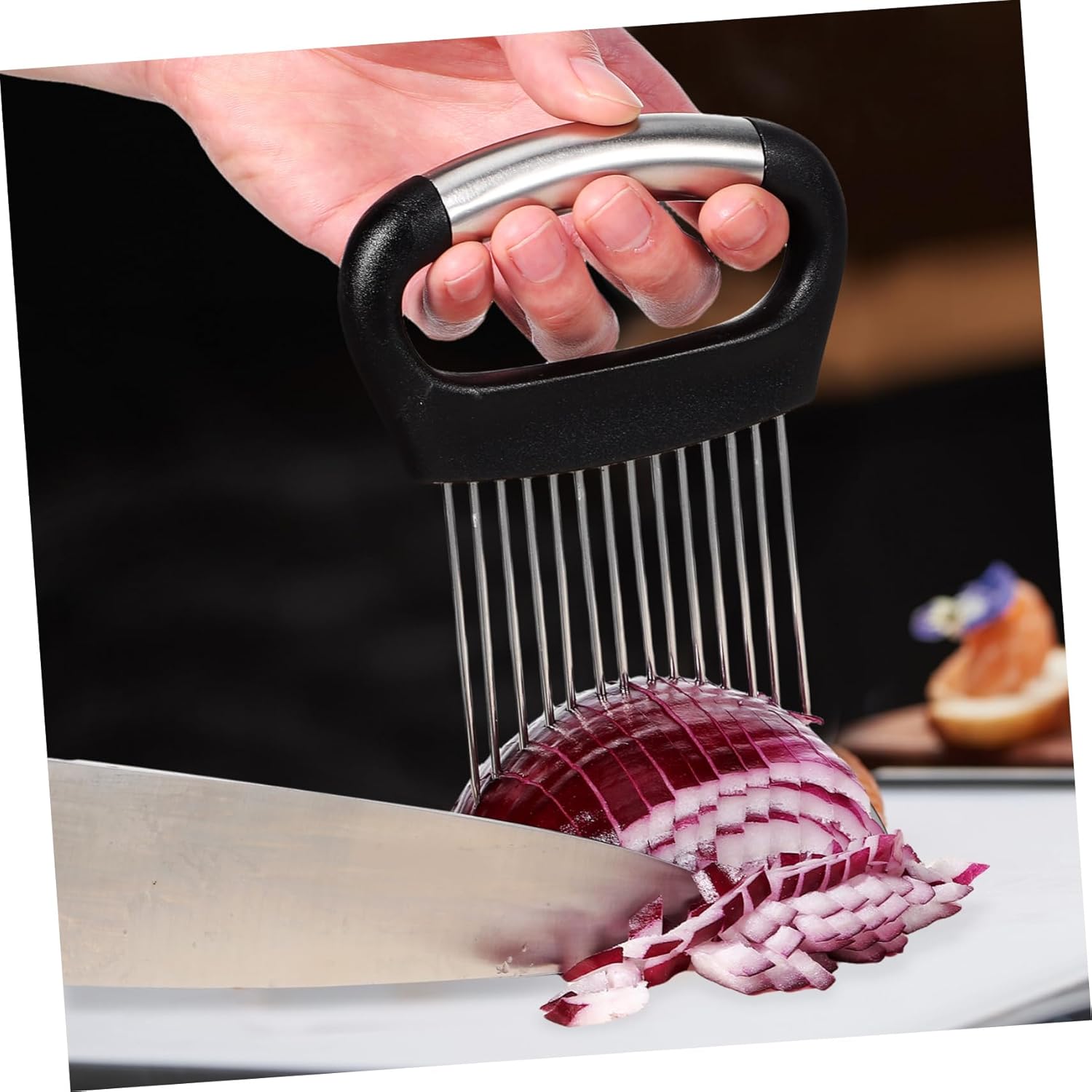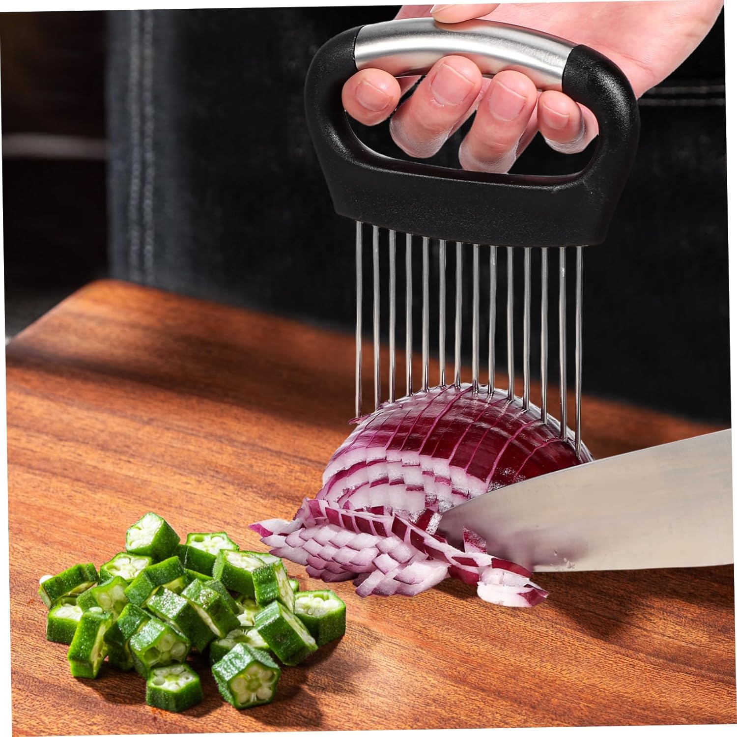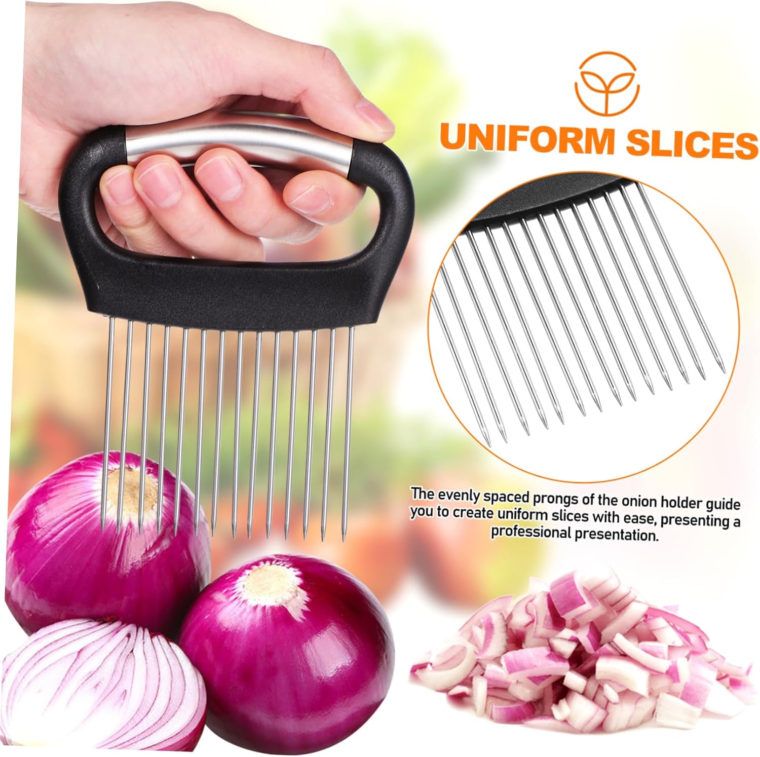 Uniform slices: the evenly spaced prongs of the onion holder guide you to create uniform slices with ease, presenting a professional presentation,onion holder for cutting,stainless steel onion holder