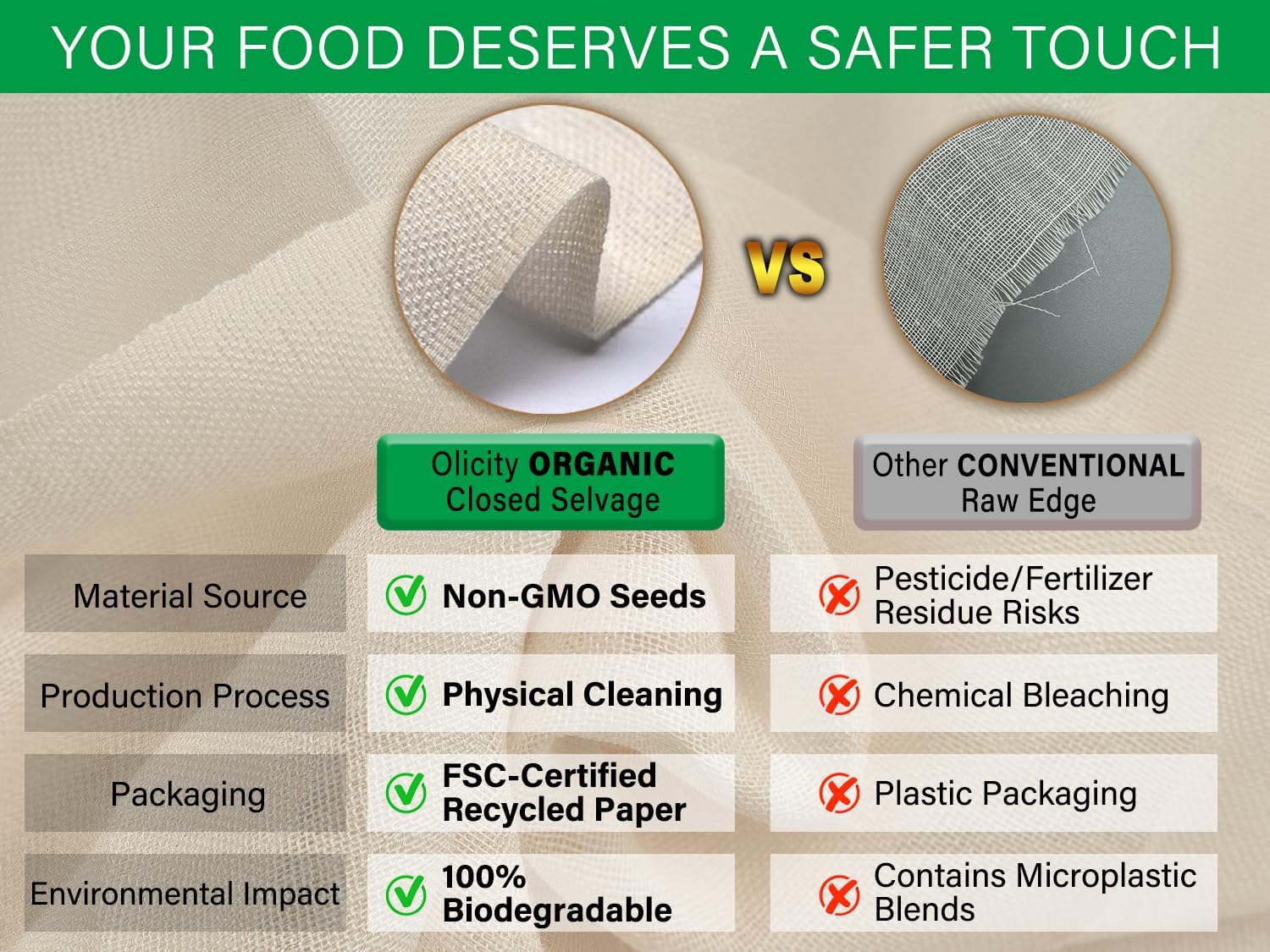 Large Size – Free cut into desired size. Closed Edges & No Shed Lint – Prevent small threads drop in the food. Easy Clean – Reused many times with a simple rinse, finally worn it out, then compost it.