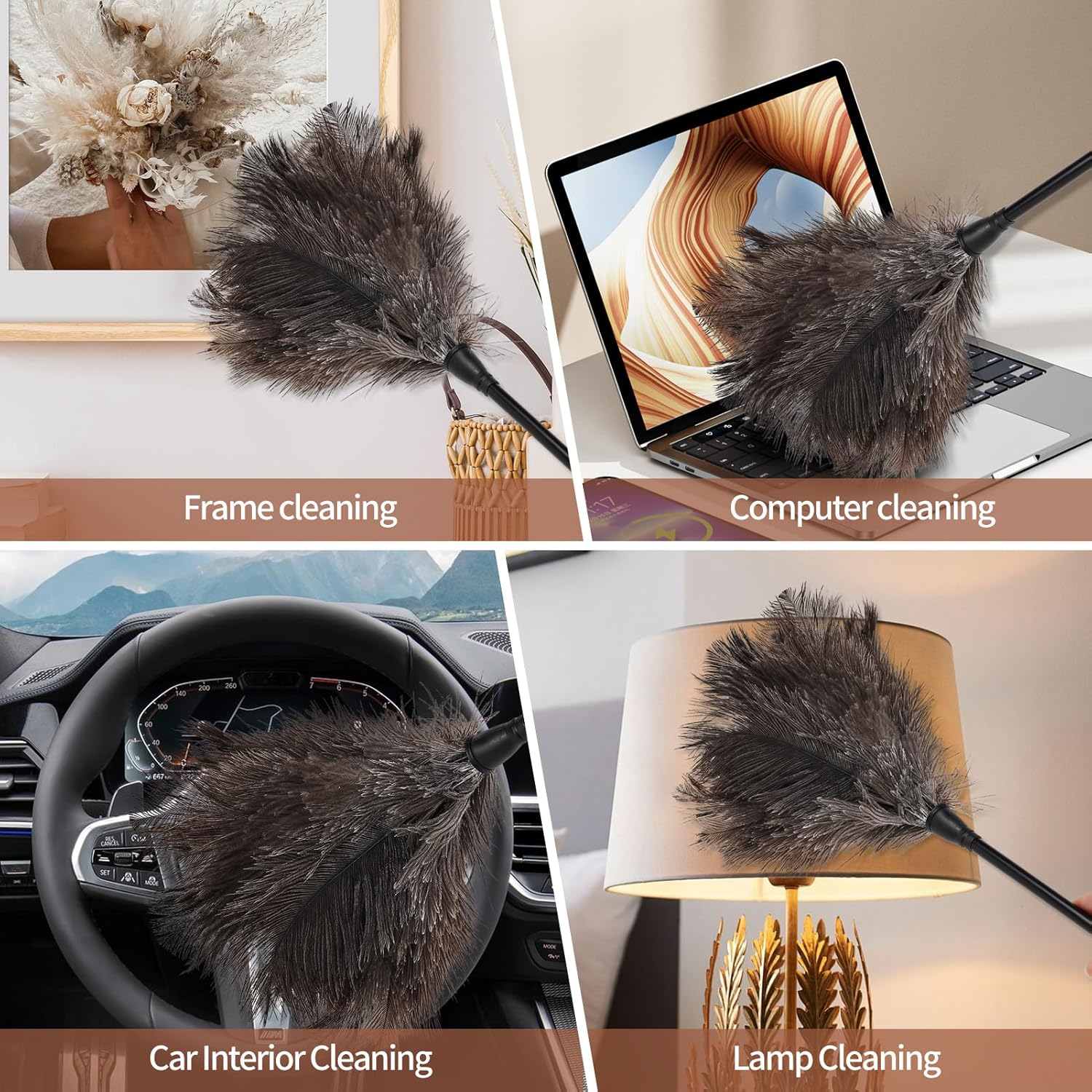 Application:Ostrich feathers are unique in that they do not produce static electricity and are gentle on delicate surfaces without causing scratches.so you can safely use feather dusters to clean screens, metal,precision instruments or fragile items,such as computer screen, keyboard, picture frame, murals, paintings, crafts and so on. You can also use it at work, at school, at home, in your car or hang it or put it in a vase as an ornament