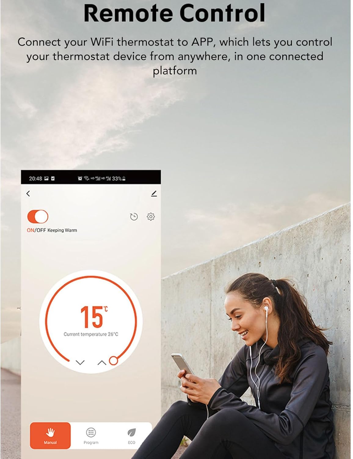 Mobile WiFi Control: Supports for Tuya for eWeLink APP. This WiFi smart thermostat supports remote control, allowing you to control the thermostat device from anywhere on a connected platform