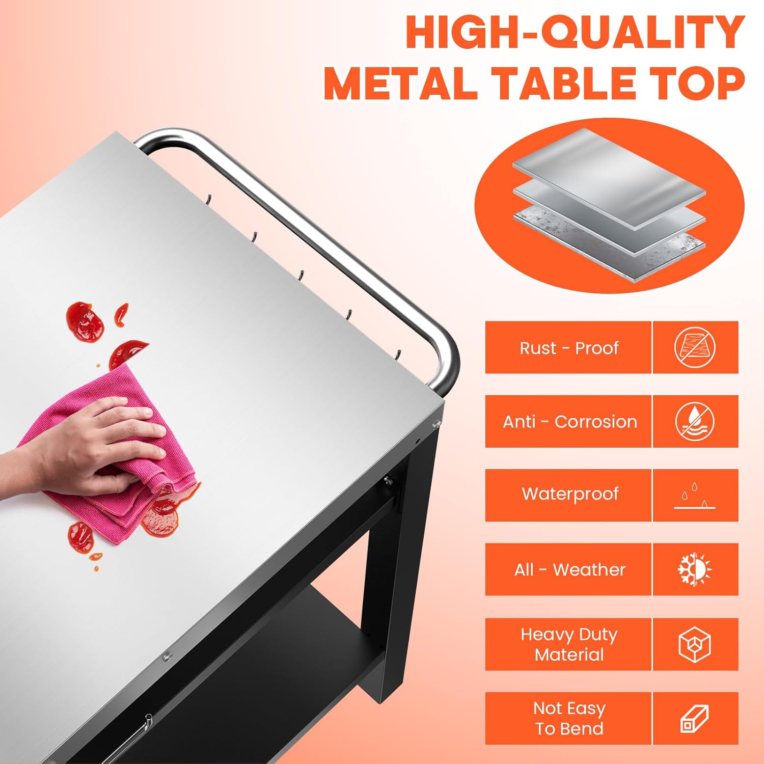 【Stable and Reliable Structure】The heavy – duty steel base frame, composed of four sturdy tubular legs and two solid feet, provides unparalleled stability. This gives it unbeatable stability. No matter the uneven ground, be it a grassy lawn, a stony driveway, or a sloping campsite, the cart stays steady. It ensures your cooking goes smoothly. You can then focus on food prep, marinating, seasoning, and grilling without worry, fully enjoying making barbecue treats