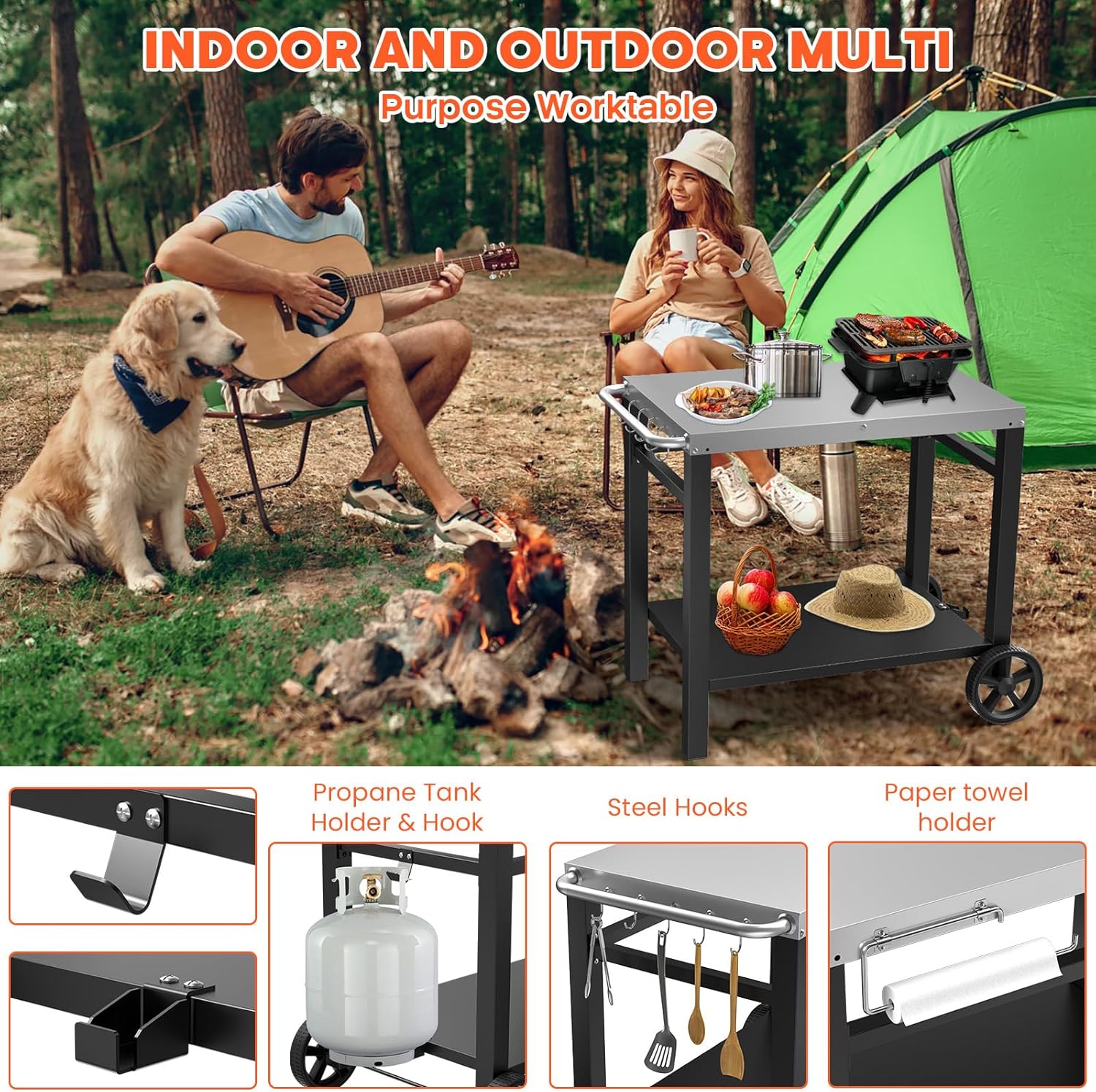 【Convenient Mobility for Effortless Cooking】The cart’s side handle, ergonomically designed, offers a comfy grip for smooth moves. Whether in the courtyard or by the vehicle, moving it is a cinch. It also doubles as storage, letting you hang towels and clips for easy access during cooking, solving mobility and storage woes. With two 360 – degree rotating rollers, operation is a breeze. Even on slopes, the cart stays put due to its special design, ensuring cooking safety
