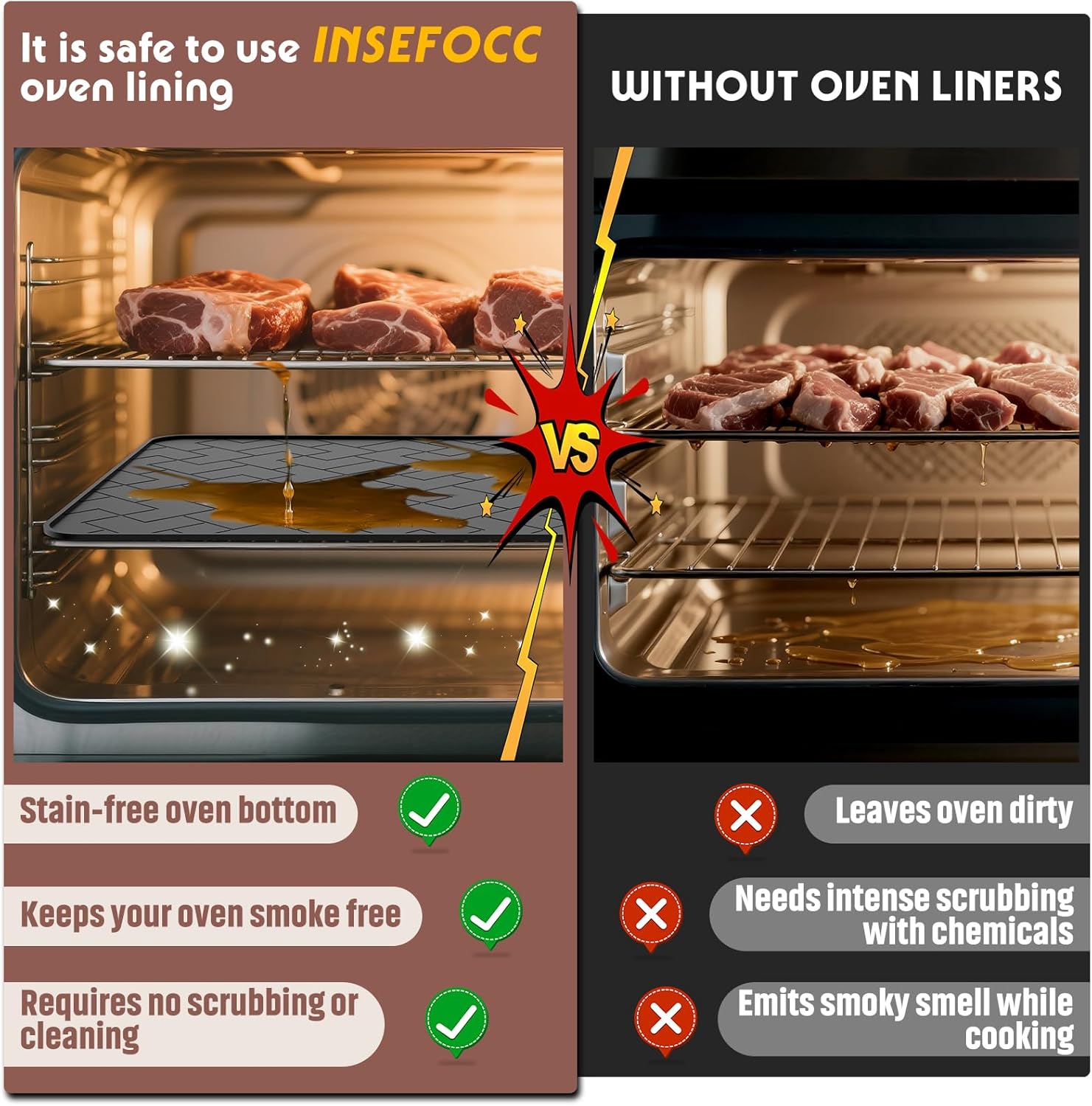 1.Versatile Compatibility: Designed as ideal oven liners for bottom of electric oven, gas oven, and toaster ovens, the insefocc silicone oven liner fits seamlessly into various cooking appliances, offering universal protection.(Important note: For ovens with heating elements, the pad must not be placed at the bottom)
