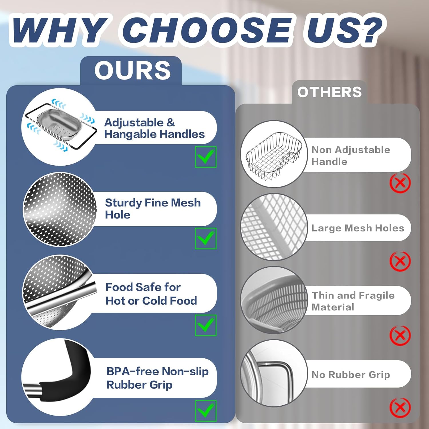 [Premium Thickened Stainless Steel] Crafted from rust-resistant, food-grade stainless steel, this over sink colander offers lasting performance. Even when handling heavy items like large amounts of pasta or fresh vegetables, our colander structure effectively prevents bending or deformation.
