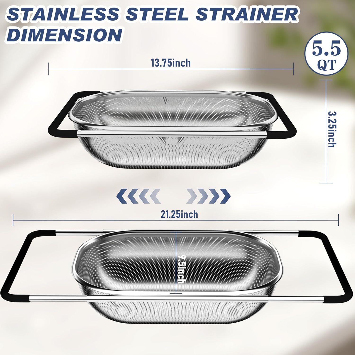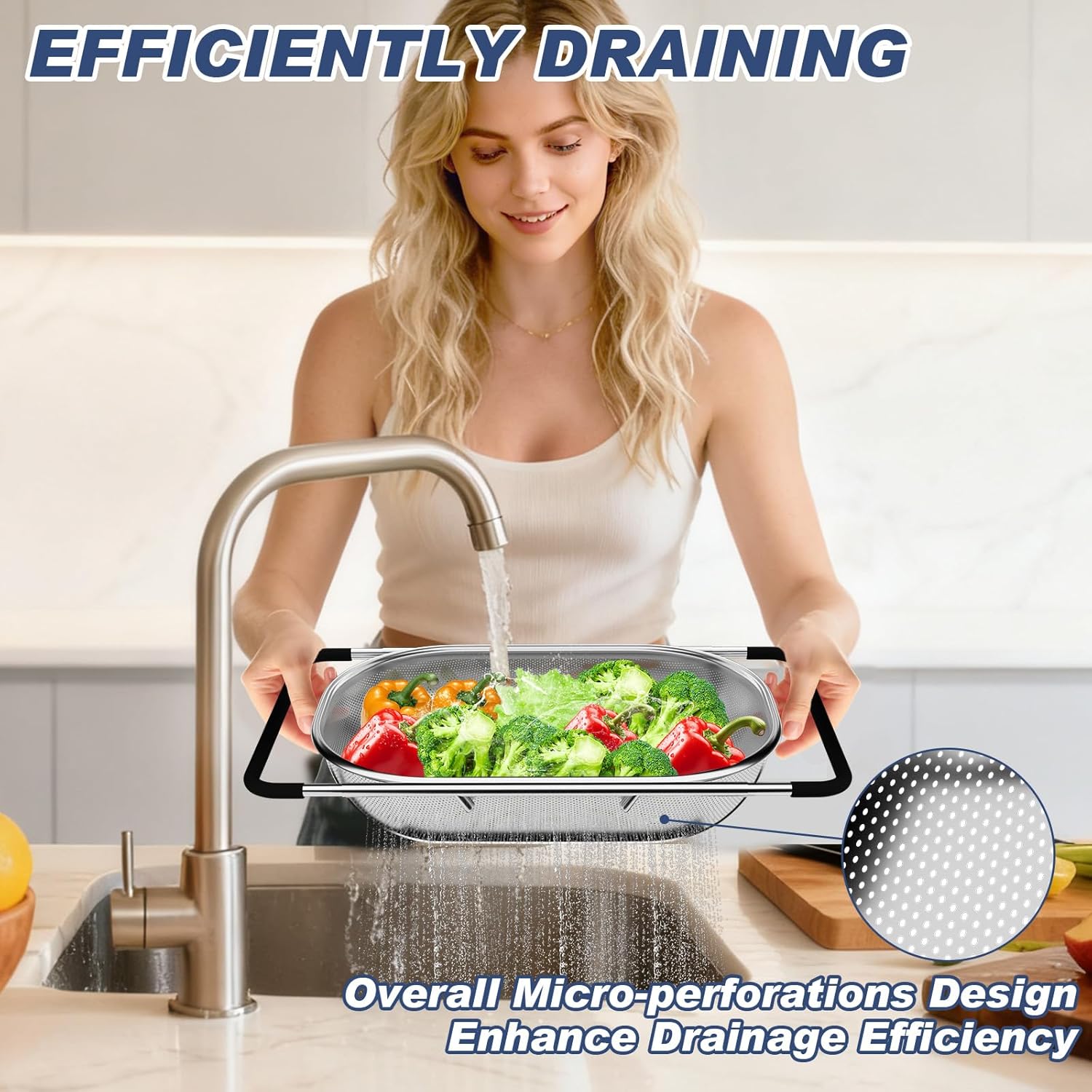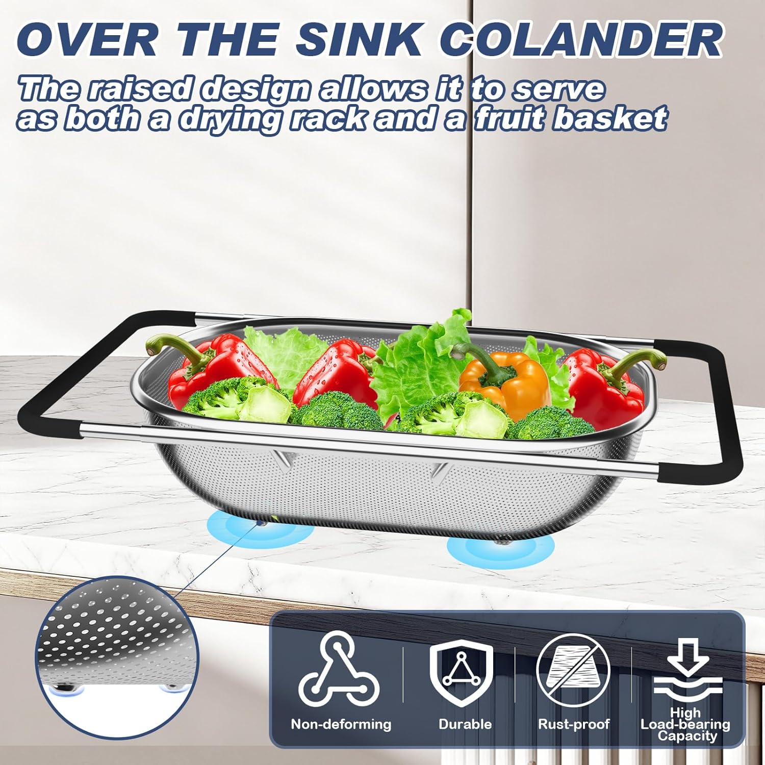 Over the Sink Colander, Expandable Strainers and Colanders with Fine Mesh, Colander for Kitchen with Rubber Grip for Draining Pasta, Vegetables and Fruits – Essential Kitchen Sink Strainer