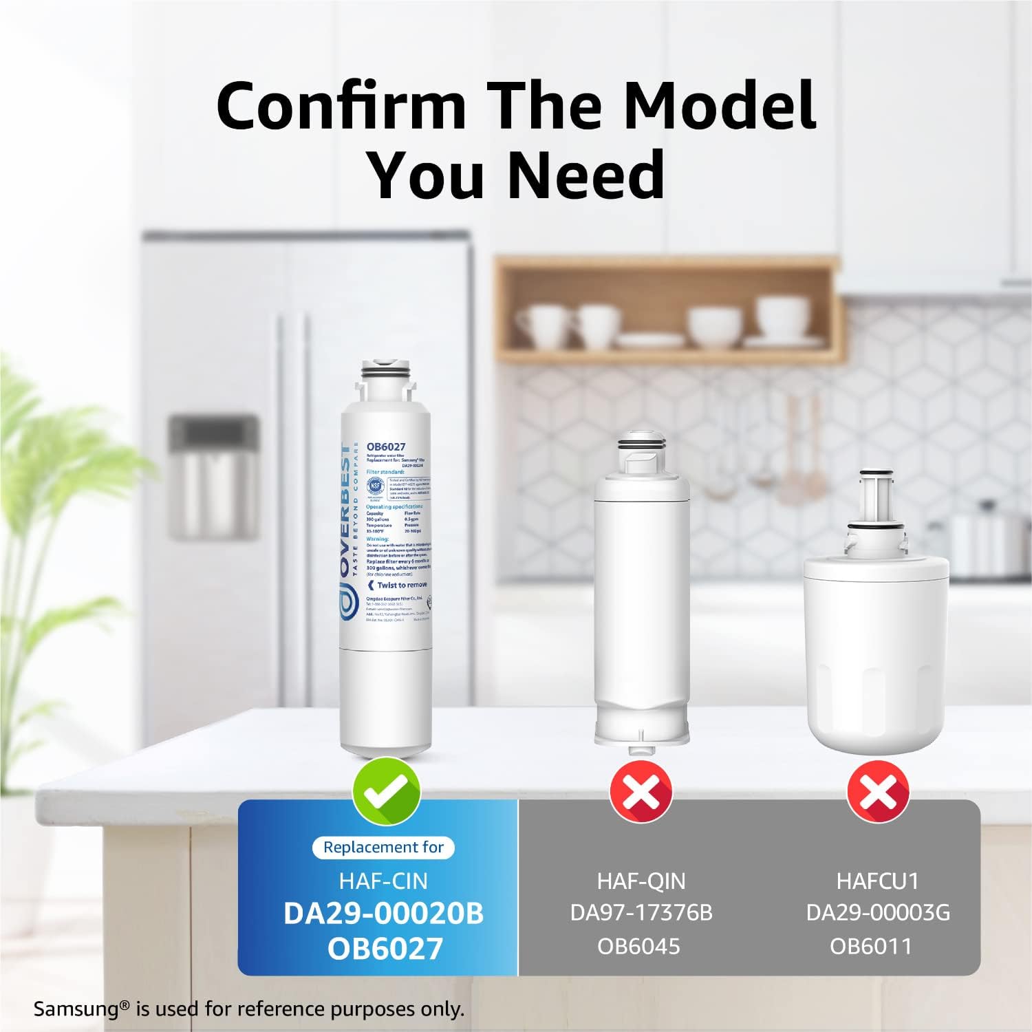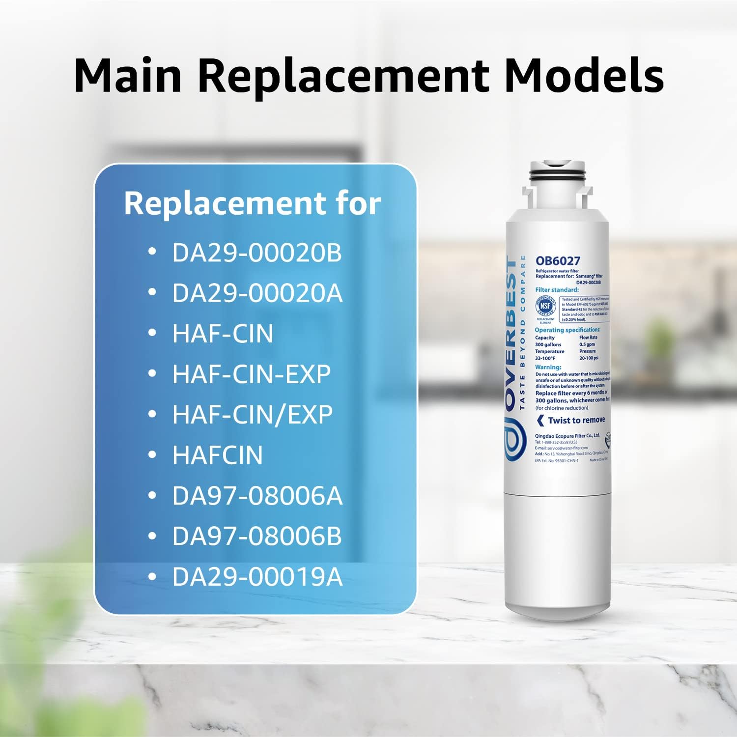 [Replacement for refrigerator filter models] This Overbest refrigerator filter is a replacement for DA29-00020B, DA29-00020A, HAF-CIN, HAF-CIN-EXP, HAF-CINEXP, HAFCIN, 04609101000, 09101, 46-9101, DA-97-08006A, DA97-08006A/B, DA29-00019A, DA2900020A, resh R-9101, Pure Line PL-200, Tier1 RWF1011, Pureza filter PF7, OnePurify RFC0700A, EcoBlueLife EBL7800, Waterdrop WD-F27, AQUACREST AQF-DA29-00020B, FilterLogic FL-RF27, Waterspecialist WS627B, Maxblue MB-00020B