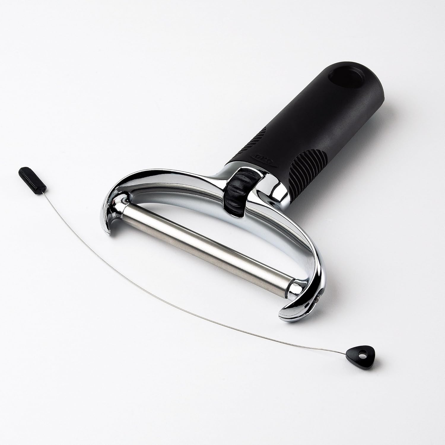Slicing cheese just got easier with the OXO good grips wire cheese slicer with replaceable wires. The stainless steel wire is easy to load and is tightened into place with the convenient tensioning wheel. The tensioning wheel can also be used to tighten wires that loosen over time. The sturdy, die cast zinc construction and the soft, comfortable handle allow you to easily pull the wire through medium and hard cheeses. Adjust the angle of your wrist to change from thick to thin cheese slices. The wire cheese slicer is dishwasher safe and includes one stainless steel replacement wire in the package.