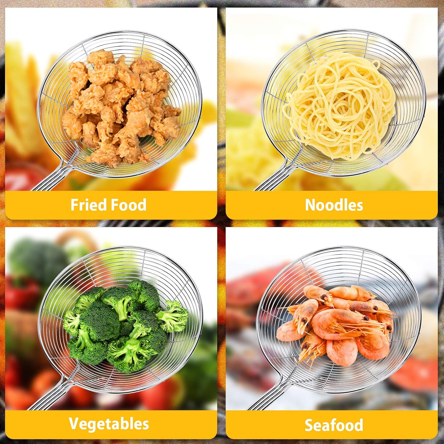 Widely Used : Our multipurpose Strainers comes with a concave basket great for separating and lifting food or draining and collecting noodles and pasta; Also good for blanching vegetables and meat, frying dumplings, French fries or serving hot pot dishes