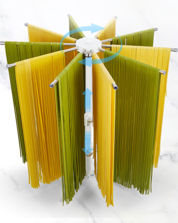 ✔ 360° Rotating & Adjustable Height Design: Our innovative foldable pasta drying rack is engineered for versatility with a 360-degree rotating top that allows effortless access to your pasta from any angle. The adjustable stainless steel drying rods range from 14.5″ ~ 23.6″ in height, with10 food-grade 304 stainless steel arms(10inch) long. Suitable for drying spaghetti, tagliatelle, fettuccine, vermicelli, linguine & lasagna.