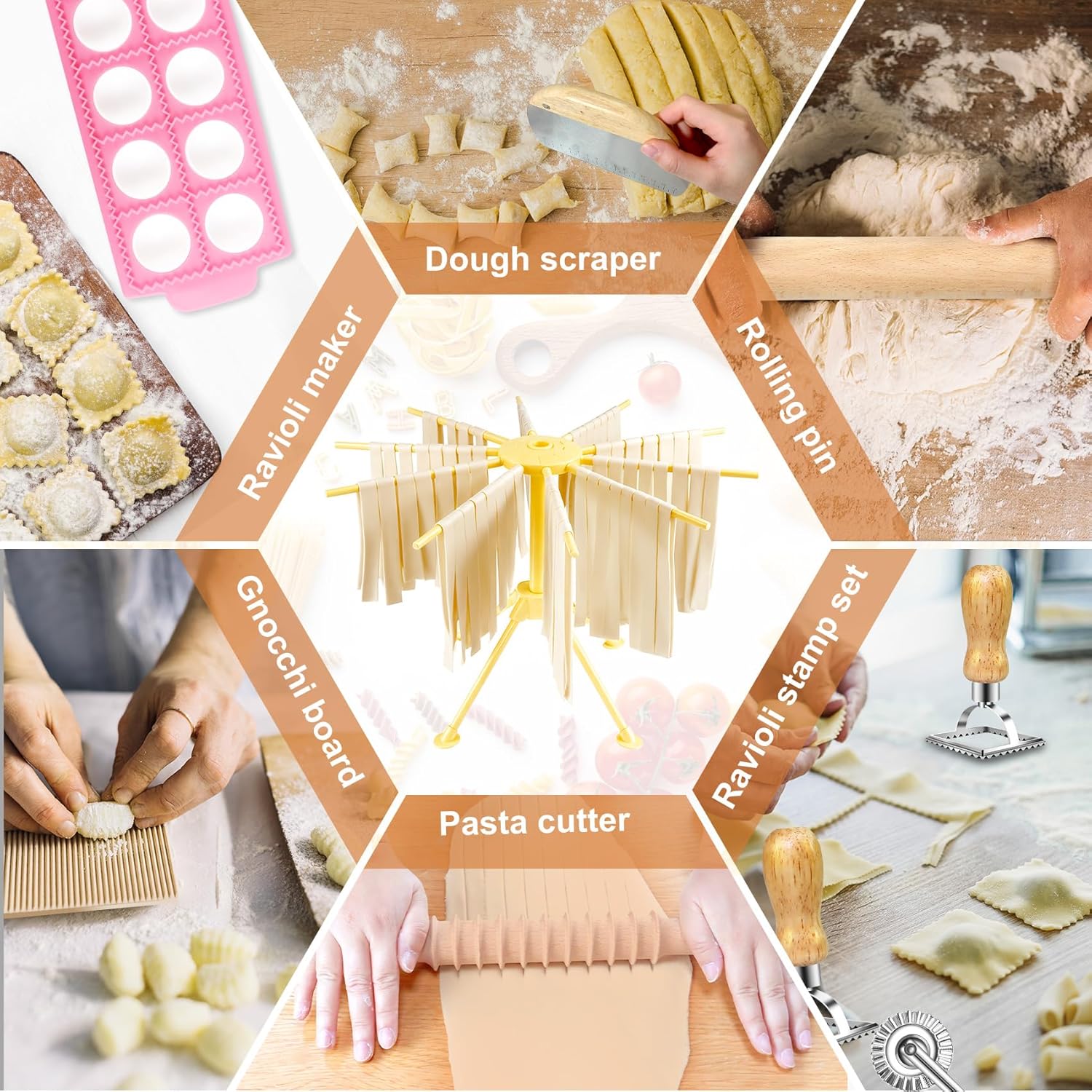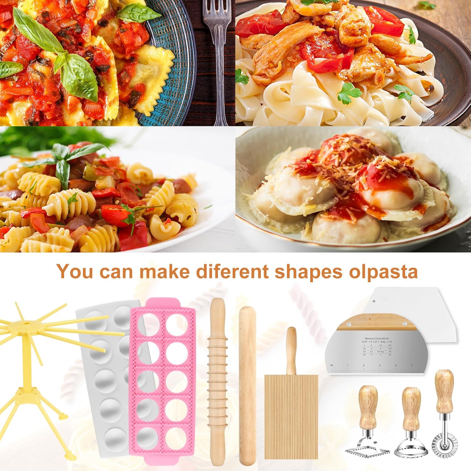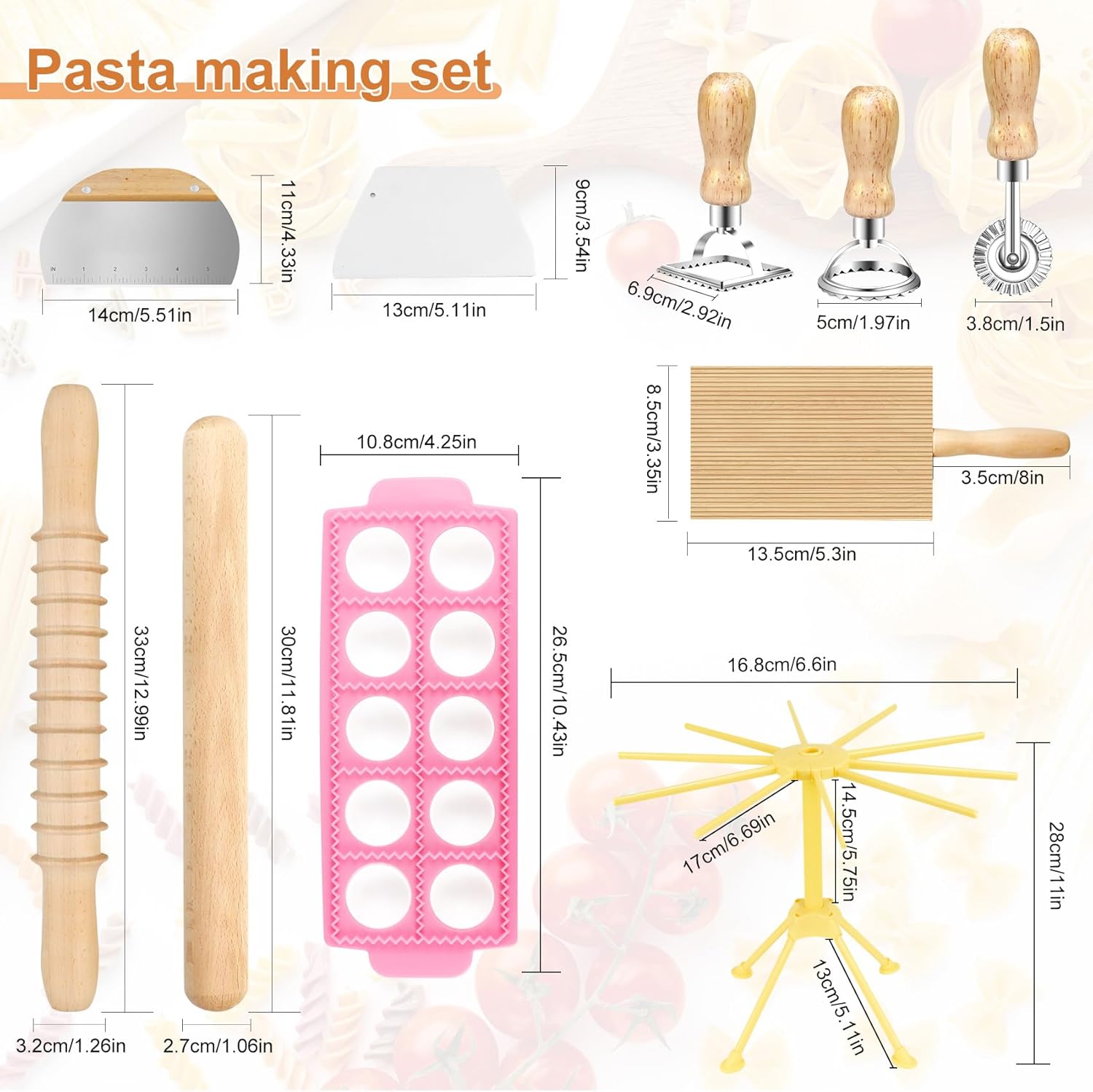 Pasta Making Tools: This Pasta Making Tools includes 1 ravioli maker, 1 threaded rolling pin,1 pasta drying rack,3 pasta stamps,1 dough scraper,1 plastic scraper,1 gnocchi board, 1 wood stick,this pasta making tool set can help you easily achieve it, making pasta making simple and enjoyable. Let you enjoy the authentic pasta making