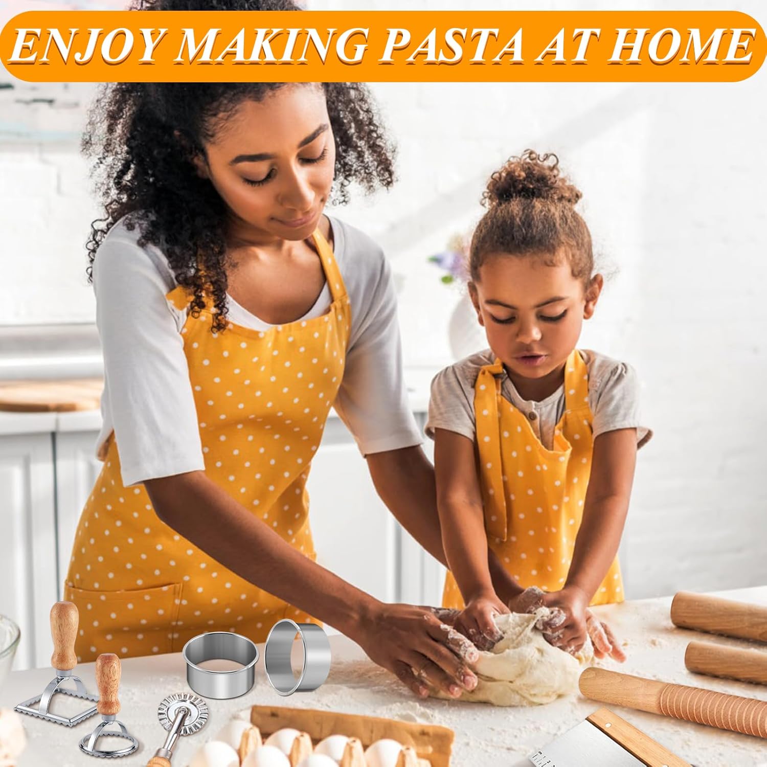 【COMPLETE PASTA MAKING KIT】 Our 10 pcs pasta making set includes 1 threaded rolling pin, 1 large rolling pin, 1 small rolling pin, 1 square pasta stamp, 1 round pasta stamp, 1 ravioli cutter wheel, 1 gnocchi board, 2 round cutter, 1 dough cutter. Whether making dumplings, pasta or ravioli, this pasta making tool set can help you easily achieve it, making pasta making simple and enjoyable. Let you enjoy the authentic pasta making experience at home.