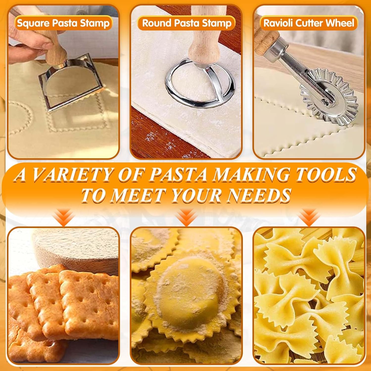 【COMPLETE PASTA MAKING KIT】 Our 10 pcs pasta making set includes 1 threaded rolling pin, 1 large rolling pin, 1 small rolling pin, 1 square pasta stamp, 1 round pasta stamp, 1 ravioli cutter wheel, 1 gnocchi board, 1 ravioli maker, 1 dough cutter, 1 baking mat. Whether making dumplings, pasta or ravioli, this pasta making tool set can help you easily achieve it, making pasta making simple and enjoyable. Let you enjoy the authentic pasta making experience at home.