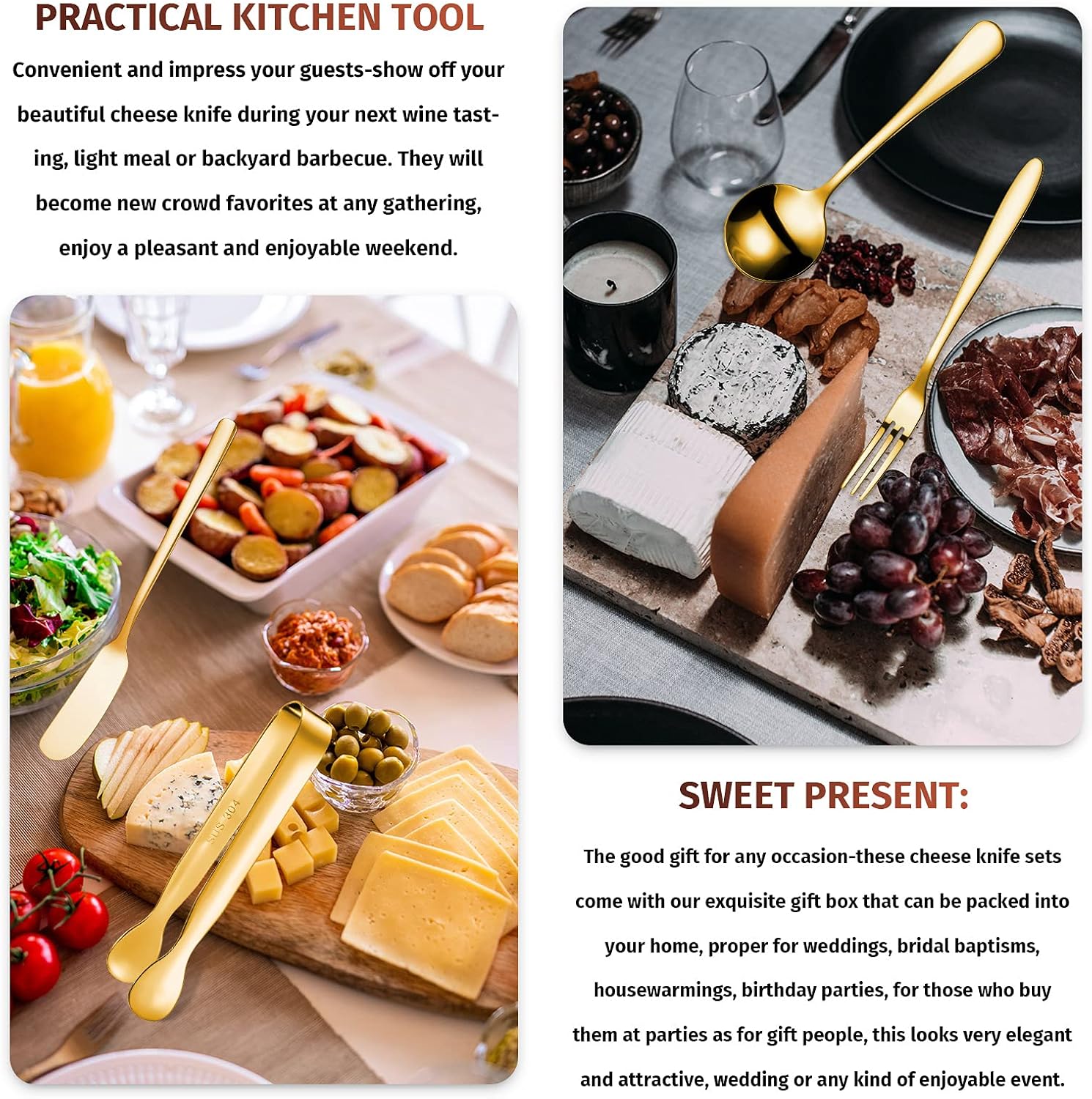 Ample quantity: includes 4 pieces cheese butter spreader knives with stainless steel handles, 2 pieces mini serving tongs, 4 small spoons and 4 small forks for serving, applied in butter, cheese, butter, jelly, butter and pastry making; It is enough to satisfy your daily needs and can be given to relatives and friends as gifts, which can bring a lot of convenience