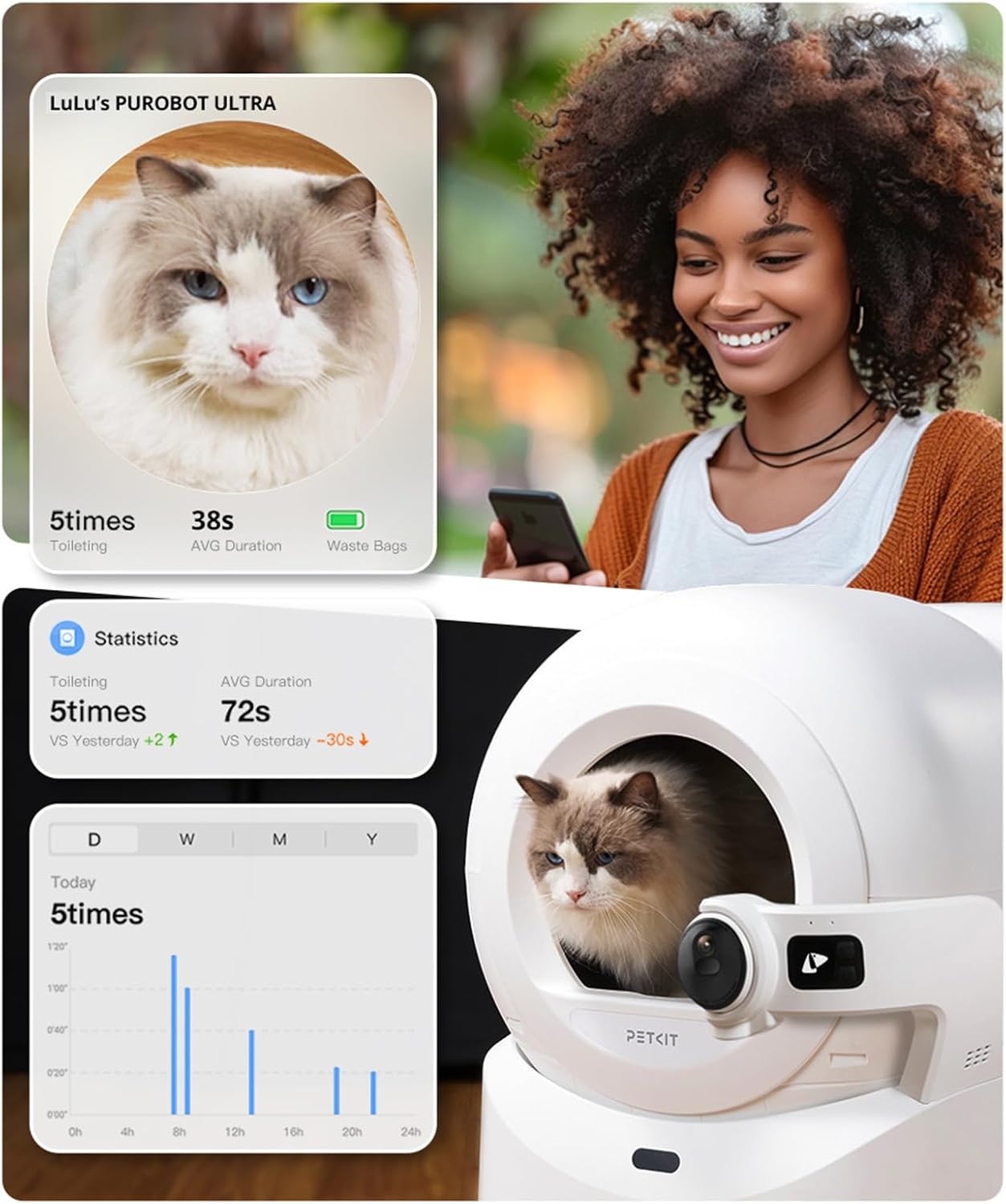 PETKIT PUROBOT ULTRA, the world’s first AI-camera self-cleaning cat litter box, automatically captures pet behaviors 24/7 with free real-time live streaming. Innovative facial recognition distinguishes between multiple cats, records individual litter box usage data and generates a personalized health report to help you monitor each cat’s well-being. Built-in two-way audio allows you to connect to your pets at all times.(Certain video cloud storage services need to be purchased in the app).