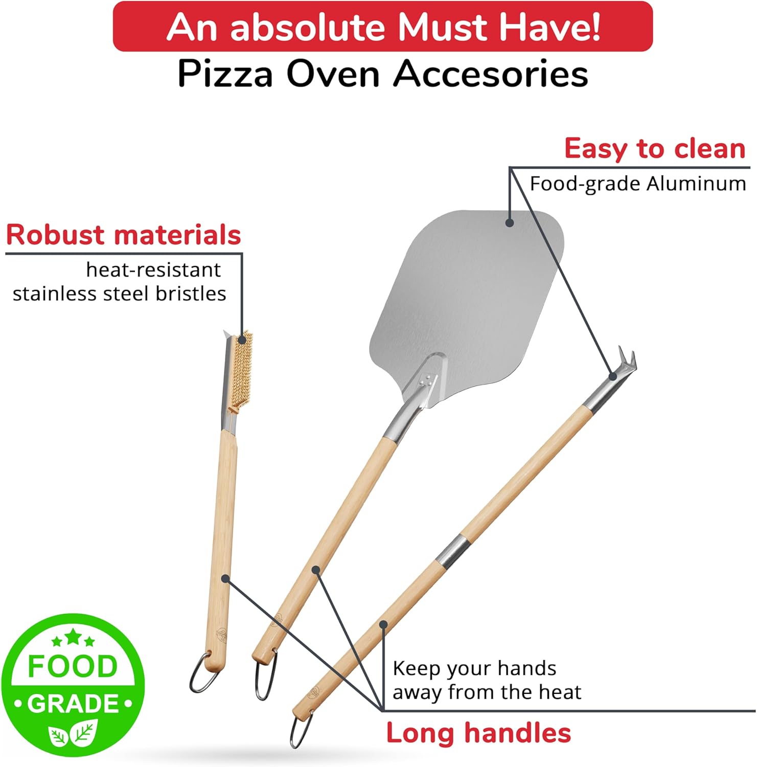 Complete Pizza Making Essentials: Master pizza creation with our essential trio – aluminum peel for smooth transfers, adjustable turner fork for precise control, and cleaning brush with scraper for maintenance, delivering everything needed for perfect pizzas.