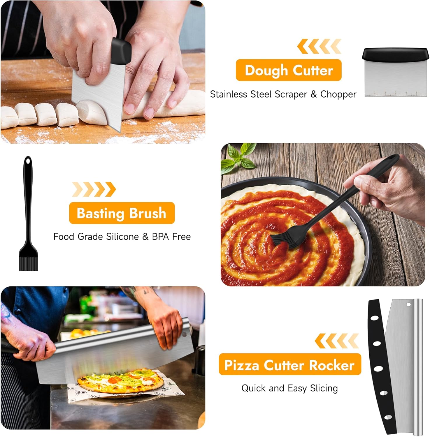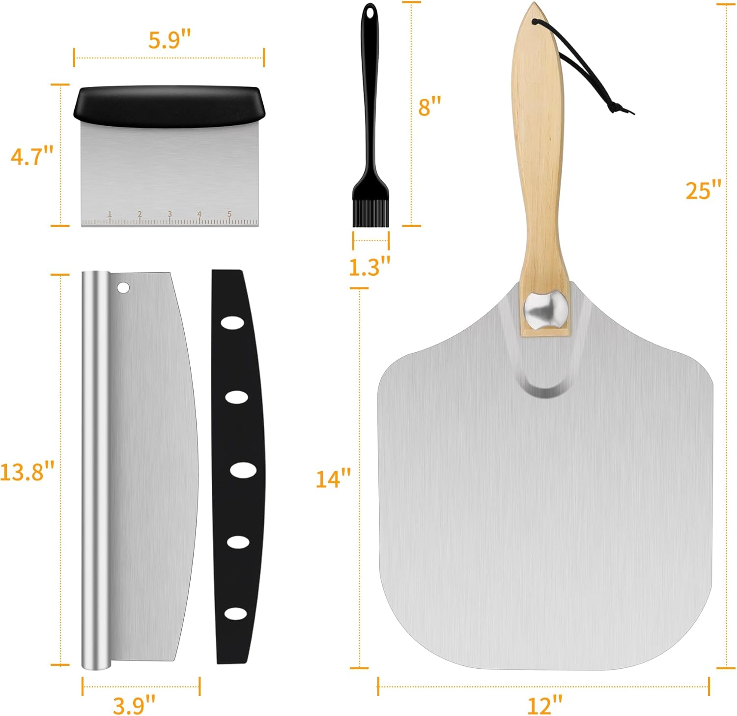 4 PCS PIZZA PEEL SET: Pizza oven accessories includes 1 x pizza peel, 1 x pizza cutter, 1 x bench scraper and 1 x oil brush, your pizza will turn out perfectly with our pizza tool set. Perfect for Christmas, New Year, Thanksgiving, Birthday, Housewarming