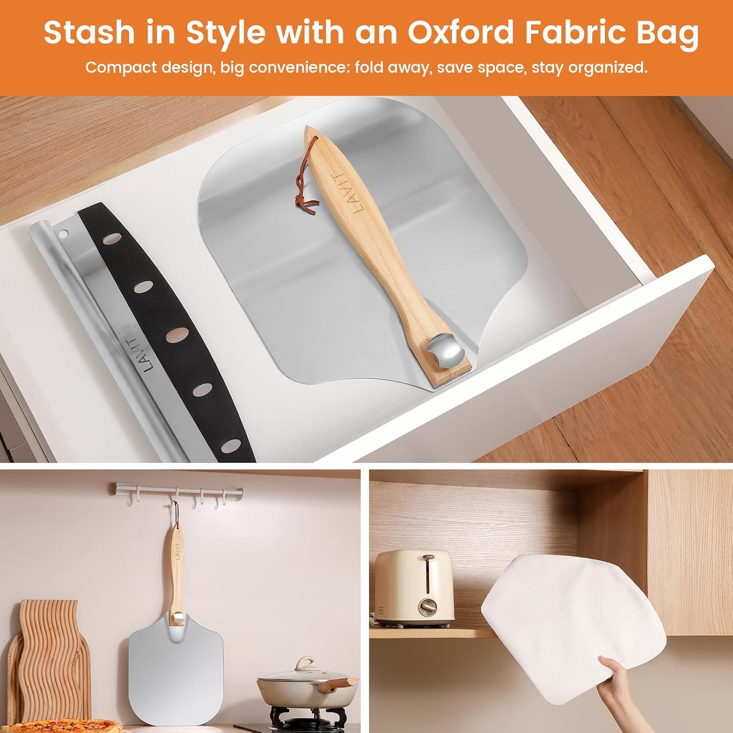 【Comes with Handy Storage Bag】: To offer flexible storage solutions, Lavit pizza peel comes with a special storage bag and 14-inch pizza rocker cutter with a cover. After you’re done using it, there’s no need to fold the metal pizza peel, simply hang it up or tuck it neatly into the provided bag, keeping your kitchen organized and the peel protected.